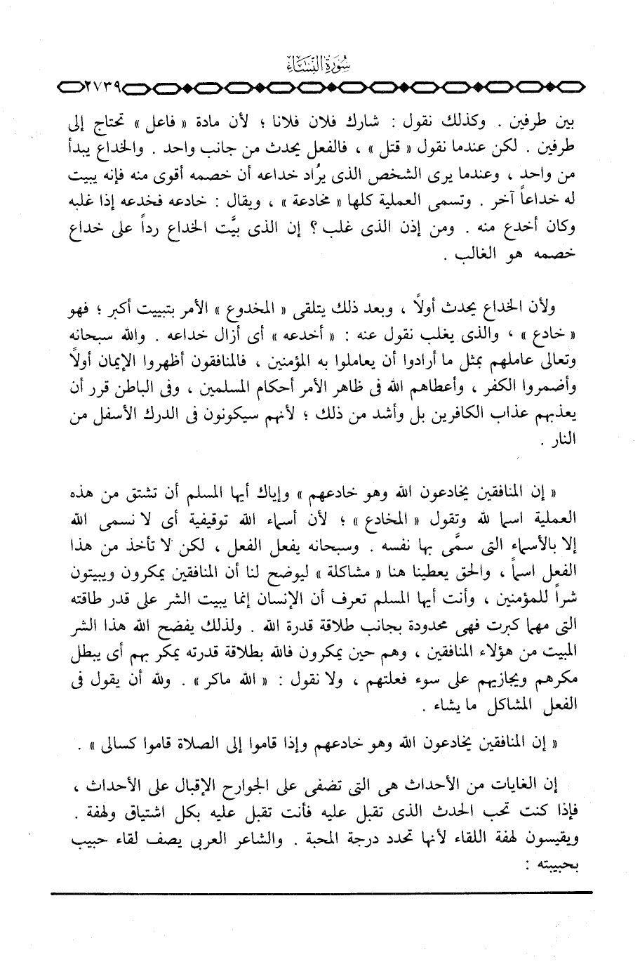 بين طرفين وكذلك نقول: شارك فلان فلانا؛ لأن مادة «فاعل» تحتاج إلى طرفين. لكن عندما نقول «قتل» ، فالفعل يحدث من جانب واحد. والخداع يبدأ من واحد، وعندما يرى الشخص الذي يُراد خداعه أن خصمه أقوى منه فإنه يبيت له خداعاً آخر، وتسمى العملية كلها «مخادعة» ، ويقال: خادعه فخدعه إذا غلبه وكان أخدع منه. ومن إذن الذي غلب؟ إن الذي بيَّت الخداع رداً على خداع خصمه هو الغالب.