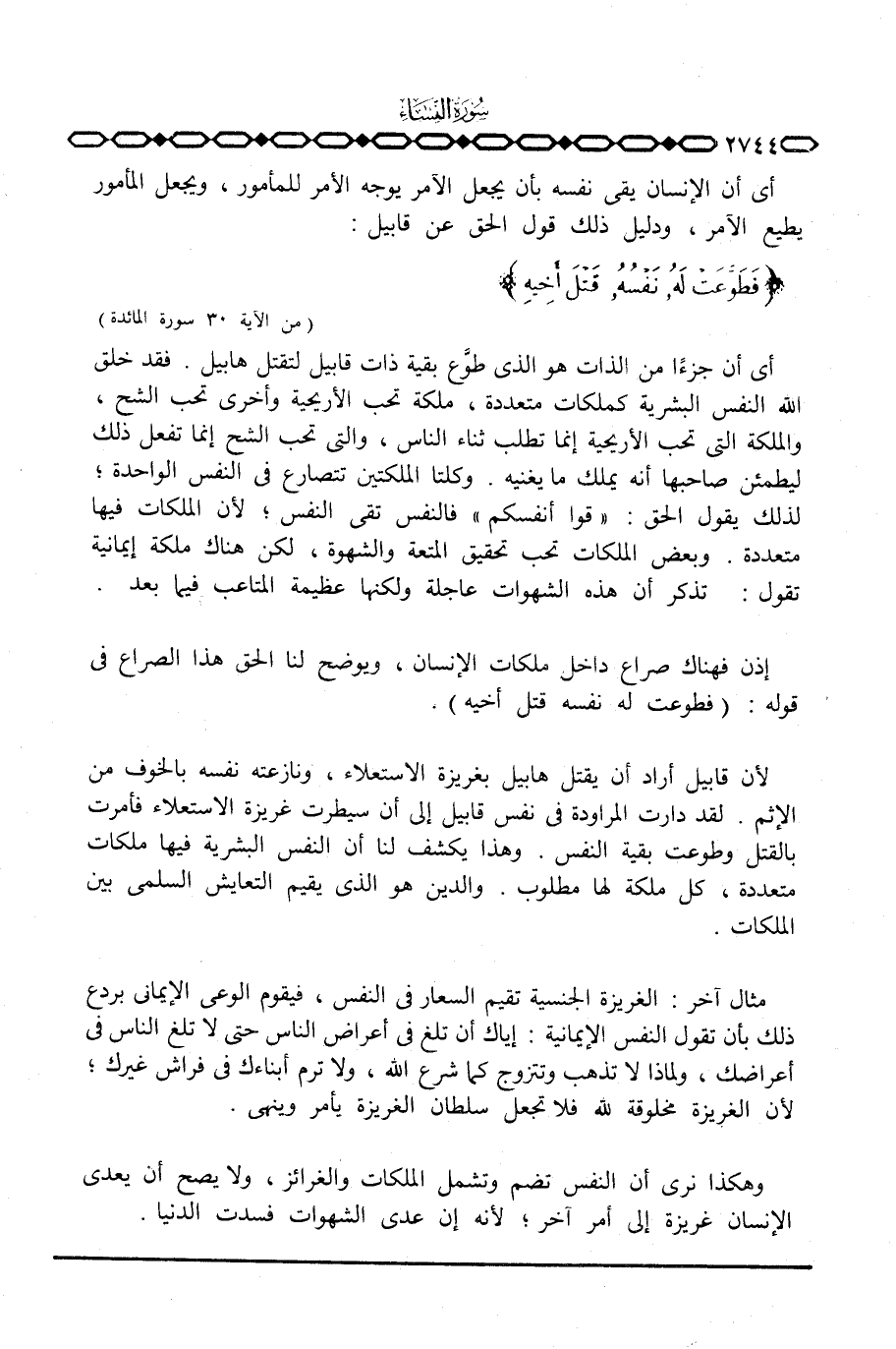 لأن قابيل أراد أن يقتل هابيل بغريزة الاستعلاء، ونازعته نفسه بالخوف من الإثم. لقد دارت المراودة في نفس قابيل إلى أن سيطرت غريزة الاستعلاء فأمرت بالقتل وطوعت بقية النفس. وهذا يكشف لنا أن النفس البشرية فيها ملكات متعددة، كل ملكة لها مطلوب. والدين هو الذي يقيم التعايش السلمي بين الملكات.