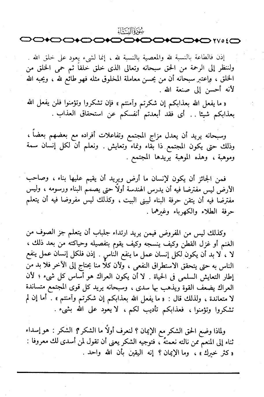 وكذلك ليس من المفروض فيمن يريد ارتداء جلباب أن يتعلم جز الصوف من الغنم أو غزل القطن وكيف ينسجه وكيف يقوم بتفصيله وحياكته من بعد ذلك، لا، لا بد أن يكون لكل إنسان عمل ما ينفع الناس. إذن فلكل إنسان عمل ينفع الناس به حتى يتحقق الاستطراق النفعي، ولأن كلاًّ منا يحتاج إلى الآخر فلا بد من إطار التعايش السلمي في الحياة. لا أن يكون العراك هو أساس كل شيء؛ لأن العراك يضعف القوة ويذهب بها سدى، وسبحانه يريد كل قوى المجتمع متساندة لا متعاندة، ولذلك قال: {مَّا يَفْعَلُ الله بِعَذَابِكُمْ إِن شَكَرْتُمْ وَآمَنْتُمْ} . أما إن لم تشكروا وتؤمنوا، فعذابكم تأديب لكم، لا يعود على الله بشيء.