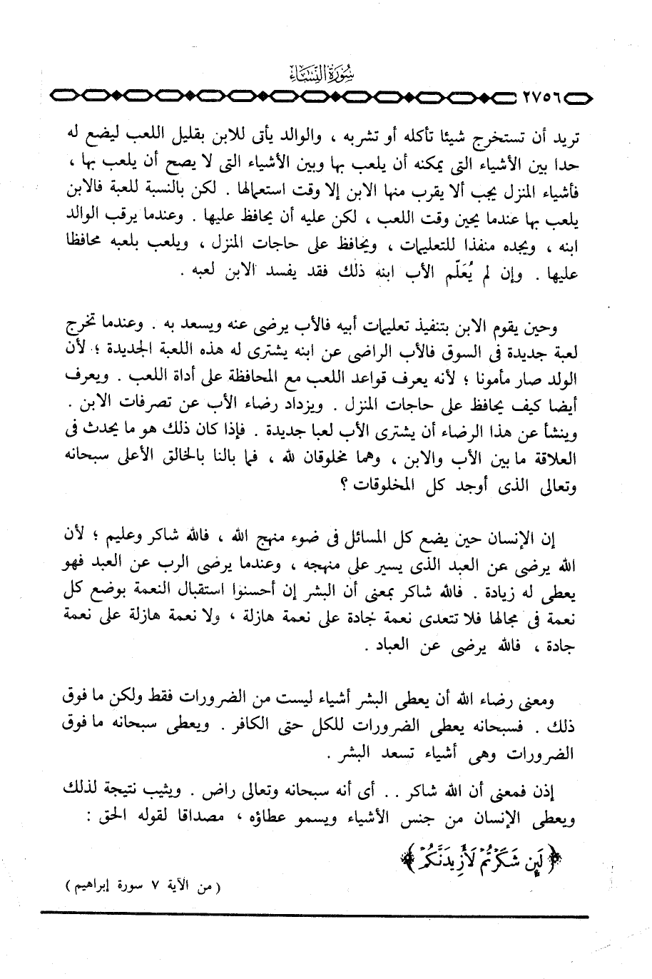 وحين يقوم الابن بتنفيذ تعليمات أبيه فالأب يرضى عنه ويسعد به. وعندما تخرج لعبة جديدة في السوق فالأب الراضي عن ابنه يشتري له هذه اللعبة الجديدة؛ لأن الولد صار مأمونا؛ لأنه يعرف قواعد اللعب مع المحافظة على أداة اللعب. ويعرف أيضا كيف يحافظ على حاجات المنزل. ويزداد رضاء الأب عن تصرفات الابن. وينشأ عن هذا الرضاء أن يشتري الأب لعبا جديدة. فإذا كان ذلك هو ما يحدث في العلاقة ما بين الأب والابن، وهما مخلوقان لله، فما بالنا بالخالق الأعلى سبحانه وتعالى الذي أوجد كل المخلوقات؟