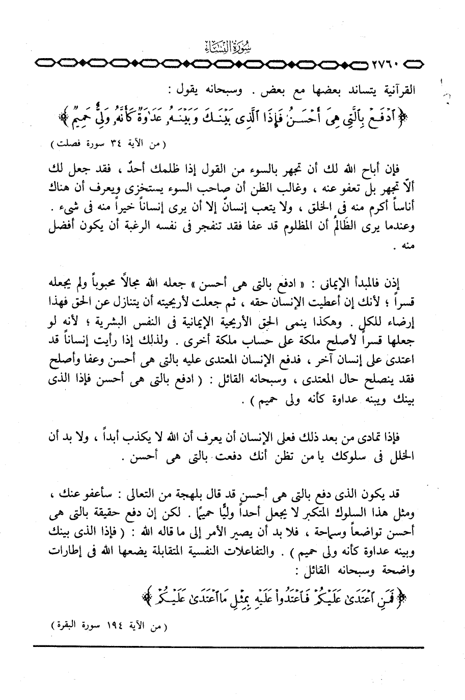 قد يكون الذي دفع بالتي هي أحسن قد قال بلهجة من التعالي: سأعفو عنك، ومثل هذا السلوك المتكبر لا يجعل أحداً وليًّا حميمًا. لكن إن دفع حقيقة بالتي هي أحسن تواضعاً وسماحة، فلا بد أن يصير الأمر إلى ما قاله الله: {فَإِذَا الذي بَيْنَكَ وَبَيْنَهُ عَدَاوَةٌ كَأَنَّهُ وَلِيٌّ حَمِيمٌ} . والتفاعلات النفسية المتقابلة يضعها الله في إطارات واضحة وسبحانه القائل: {فَمَنِ اعتدى عَلَيْكُمْ فاعتدوا عَلَيْهِ بِمِثْلِ مَا اعتدى عَلَيْكُمْ} [البقرة: 194]
