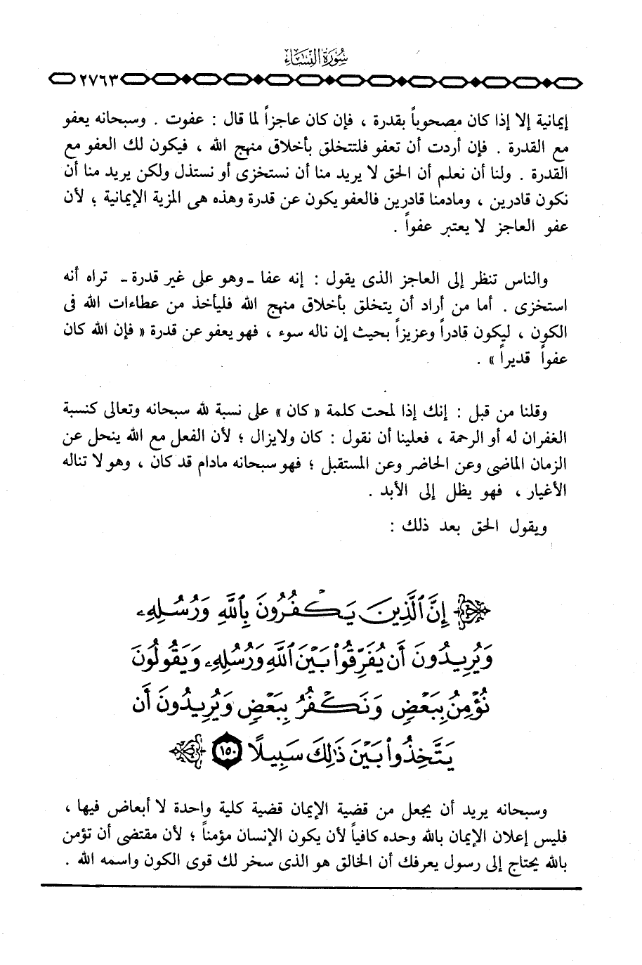 والناس تنظر إلى العاجز الذي يقول: إنه عفا - وهو على غير قدرة - تراه أنه استخزى. أما من أراد أن يتخلق بأخلاق منهج الله فليأخذ من عطاءات الله في الكون، ليكون قادراً وعزيزاً بحيث إن ناله سوء، فهو يعفو عن قدرة {فَإِنَّ الله كَانَ عَفُوّاً قَدِيراً} .