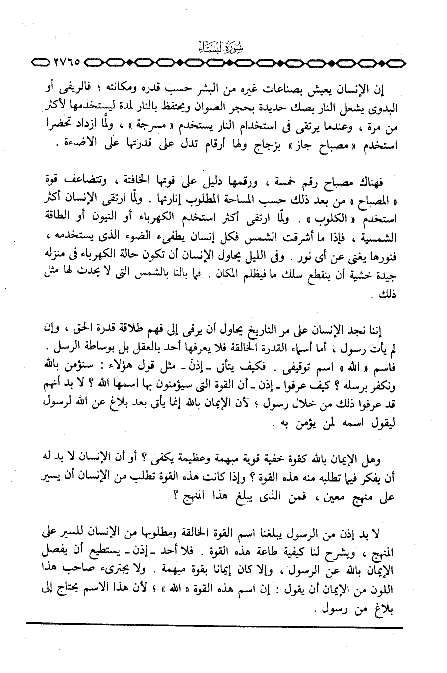 فهناك مصباح رقم خمسة، ورقمها دليل على قوتها الخافتة، وتتضاعف قوة «المصباح» من بعد ذلك حسب المساحة المطلوب إنارتها. ولمّا ارتقى الإنسان أكثر استخدم «الكلوب» . ولمّا ارتقى أكثر استخدم الكهرباء أو النيون أو الطاقة الشمسية، فإذا ما أشرقت الشمس فكل إنسان يطفئ الضوء الذي يستخدمه، فنورها يغني عن أي نور. وفي الليل يحاول الإنسان أن تكون حالة الكهرباء في منزله جيدة خشية أن ينقطع سلك ما فيظلم المكان. فما بالنا بالشمس التي لا يحدث لها مثل ذلك.