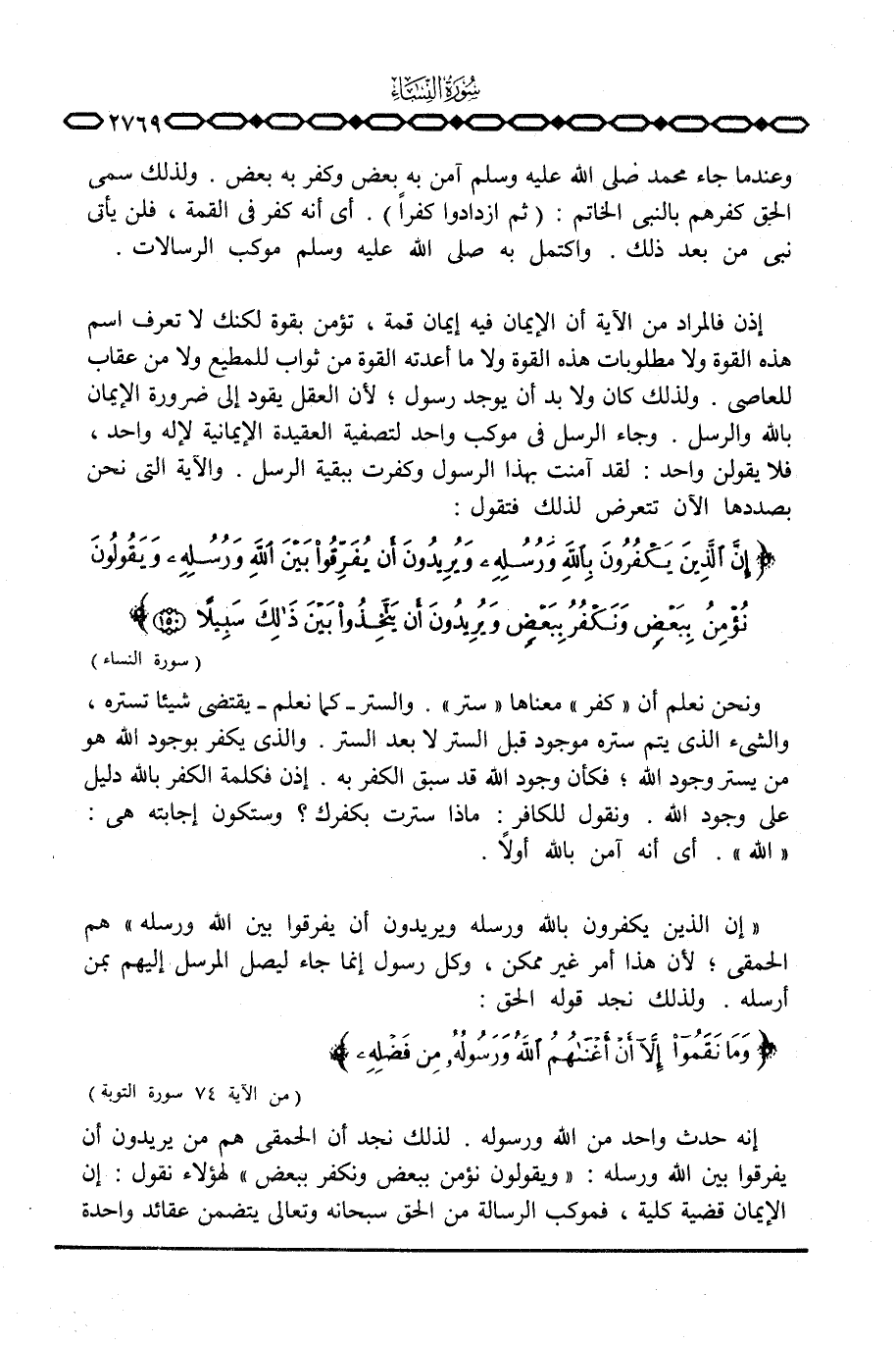 إذن فالمراد من الآية أن الإيمان فيه إيمان قمة، تؤمن بقوة لكنك لا تعرف اسم هذه القوة ولا مطلوبات هذه القوة ولا ما ادته القوة من ثواب للمطيع ولا من عقاب للعاصي. ولذلك كان ولا بد أن يوجد رسول؛ لأن العقل يقود إلى ضرورة الإيمان بالله والرسل. وجاء الرسل في موكب واحد لتصفية العقيدة الإيمانية للإله واحد، فلا يقولن واحد: لقد آمنت بهذا الرسول وكفرت ببقية الرسل. والآية التي نحن بصددها الآن تتعرض لذلك فتقول: {إِنَّ الذين يَكْفُرُونَ بالله وَرُسُلِهِ وَيُرِيدُونَ أَن يُفَرِّقُواْ بَيْنَ الله وَرُسُلِهِ وَيقُولُونَ نُؤْمِنُ بِبَعْضٍ وَنَكْفُرُ بِبَعْضٍ وَيُرِيدُونَ أَن يَتَّخِذُواْ بَيْنَ ذلك سَبِيلاً} [النساء: 150]