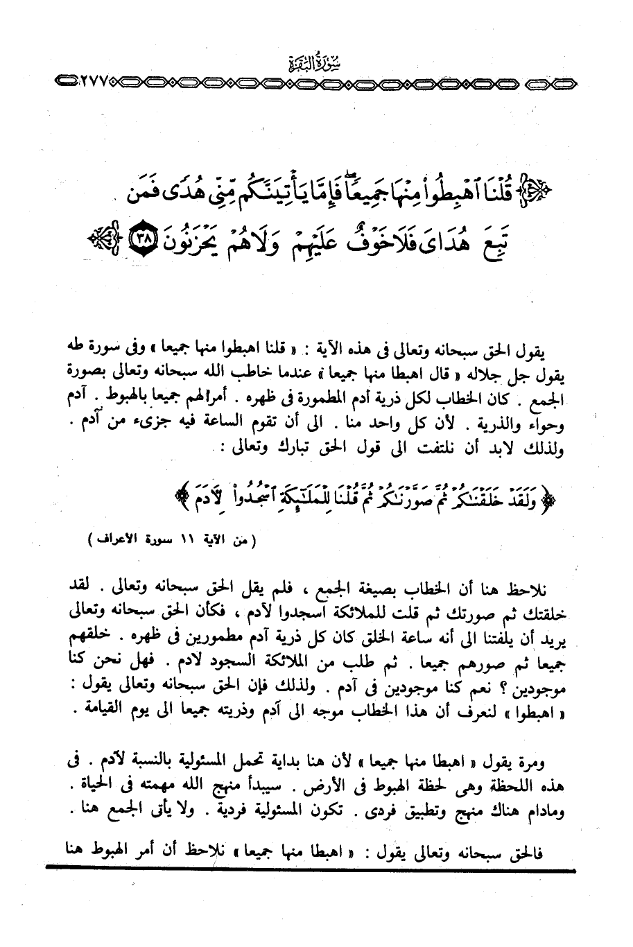 نلاحظ هنا أن الخطاب بصيغة الجمع، فلم يقل الحق سبحانه وتعالى. لقد خلقتك ثم صورتك ثم قلت للملائكة اسجدوا لآدم، فكأن الحق سبحانه وتعالى يريد أن يلفتنا إلى أنه ساعة الخلق كان كل ذرية آدم مطمورين في ظهره. خلقهم جميعا ثم صورهم جميعا. ثم طلب من الملائكة السجود لآدم. فهل نحن كنا موجودين؟ نعم كنا موجودين في آدم. ولذلك فإن الحق سبحانه وتعالى يقول: «اهبطوا» لنعرف أن هذا الخطاب موجه إلى آدم وذريته جميعا إلى يوم القيامة.