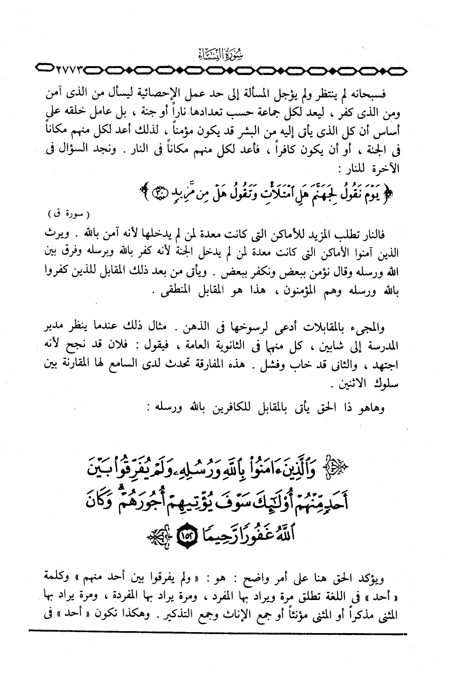 ويؤكد الحق هنا على أمر واضح: هو: {وَلَمْ يُفَرِّقُواْ بَيْنَ أَحَدٍ مِّنْهُمْ} وكلمة «أحد» في اللغة تطلق مرة ويراد بها المفرد، ومرة يراد بها المفردة، ومرة يراد بها المثنى مذكراً أو المثنى مؤنثاً أو جمع الإناث وجمع التذكير. وهكذا تكون «أحد» في