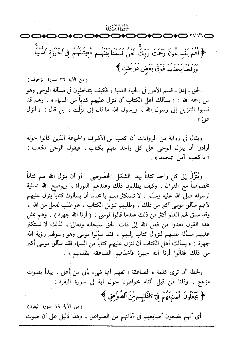 ويًنَزَّلُ إلى كل واحد كتاباً بهذا الشكل الخصوصي. أو أن ينزل الله لهم كتاباً مخصوصاً مع القرآن. وكيف يطلبون ذلك وعندهم التوراة، ويوضح الله تسلية لرسوله صَلَّى اللَّهُ عَلَيْهِ وَسَلَّم َ: لا تستكثر منهم يا محمد أن يسألوك كتاباً ينزل عليهم لأنهم سألوا موسى أكبر من ذلك، وطلبهم تنزيل الكتاب، هو طلب لفعل من الله، وقد سبق لهم الغلو أكثر من ذلك عندما قالوا لموسى: {أَرِنَا الله جَهْرَةً} . وهم بمثل هذا القول تعدوا من فعل الله إلى ذات الحق سبحانه وتعالى، لذلك لا تستكثر عليهم مسألة طلبهم لنزول كتاب إليهم، فقد سألوا موسى وهو رسولهم رؤية الله جهرة: {يَسْأَلُكَ أَهْلُ الكتاب أَن تُنَزِّلَ عَلَيْهِمْ كِتَاباً مِّنَ السمآء فَقَدْ سَأَلُواْ موسى أَكْبَرَ مِن ذلك فقالوا أَرِنَا الله جَهْرَةً فَأَخَذَتْهُمُ الصاعقة بِظُلْمِهِمْ} .