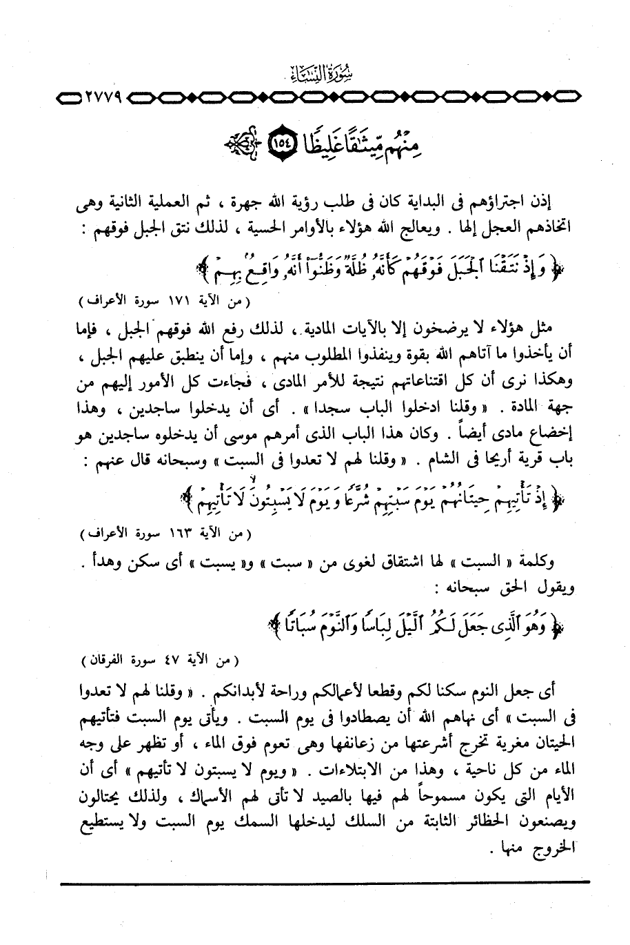 أي جعل النوم سكنا لكم وقطعا لأعمالكم وراحة لأبدانكم. {وَقُلْنَا لَهُمْ لاَ تَعْدُواْ فِي السبت} أي نهاهم الله أن يصطادوا في يوم السبت. ويأتي يوم السبت فتأتيهم الحيتان مغرية تخرج أشرعتها من زعانفها وهي تعوم فوق الماء، أو تظهر على وجه الماء من كل ناحية، وهذا من الابتلاءات. {وَيَوْمَ لاَ يَسْبِتُونَ لاَ تَأْتِيهِمْ} أي أن الأيام التي يكون مسموحاً لهم فيها بالصيد لا تأتي لهم الأسماك، ولذلك يحتالون ويصنعون الحظائر الثابتة من السلك ليدخلها السمك يوم السبت ولا يستطيع الخروج منها.