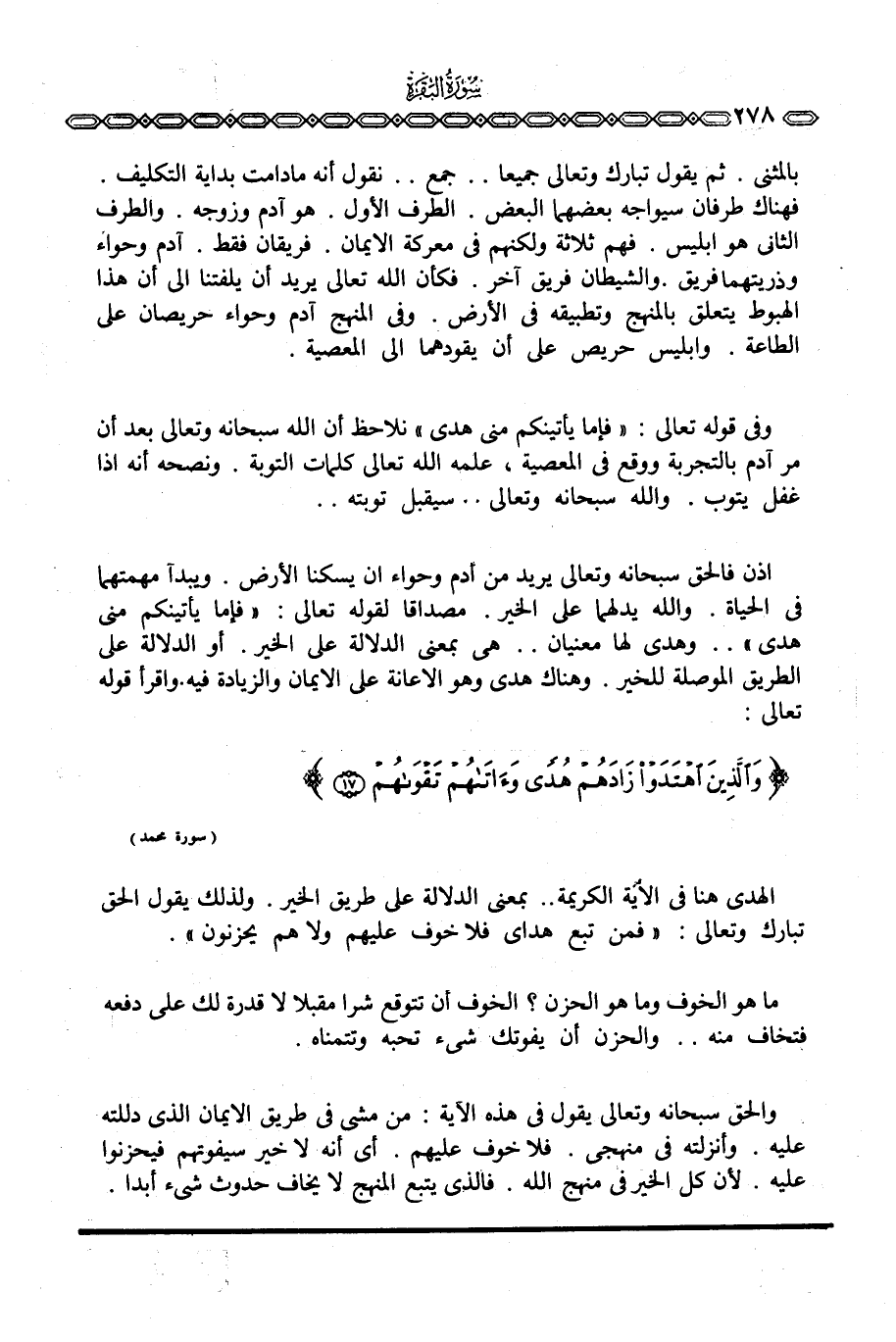 إذن فالحق سبحانه وتعالى يريد من آدم وحواء أن يسكنا الأرض. ويبدآ مهمتهما في الحياة. والله يدلهما على الخير. مصداقا لقوله تعالى: {فَإِمَّا يَأْتِيَنَّكُم مِّنِّي هُدًى} . . وهدى لها معنيان. . هي بمعنى الدلالة على الخير. أو الدلالة على الطريق الموصلة للخير. وهناك هدى وهو الإعانة على الإيمان والزيادة فيه. واقرأ قوله تعالى: {والذين اهتدوا زَادَهُمْ هُدًى وَآتَاهُمْ تَقُوَاهُمْ} [محمد: 17]