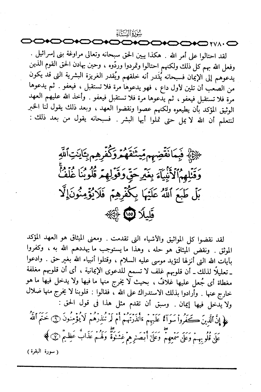 لقد نقضوا كل المواثيق والأشياء التي تقدمت. ومعنى الميثاق هو العهد المؤكد الموثق. ونقض الميثاق هو حله، وهذا ما يستوجب ما يهددهم الله به، وكفروا بآيات الله التي أنزلها لتؤيد موسى عليه السلام، وقتلوا أنبياء الله بغير حق. وادعوا - تعليلاً لذلك - أن قلوبهم غلف لا تسمع للدعوى الإيمانية، أي أن قلوبهم مغلفة مغطاة أي جُعل عليها غلافٌ، بحيث لا يخرج منها ما فيها ولا يدخل فيها ما هو خارج عنها. وأرادوا بذلك الاستدراك على الله، فقالوا: قلوبنا لا يخرج منها ضلال ولا يدخل فيها إيمان. وسبق أن تقدم مثل هذا في قول الحق: {إِنَّ الذين كَفَرُواْ سَوَآءٌ عَلَيْهِمْ أَأَنذَرْتَهُمْ أَمْ لَمْ تُنْذِرْهُمْ لاَ يُؤْمِنُونَ خَتَمَ الله على قُلُوبِهمْ وعلى سَمْعِهِمْ وعلى أَبْصَارِهِمْ غِشَاوَةٌ وَلَهُمْ عَذَابٌ عظِيمٌ} [البقرة: 6 - 7]