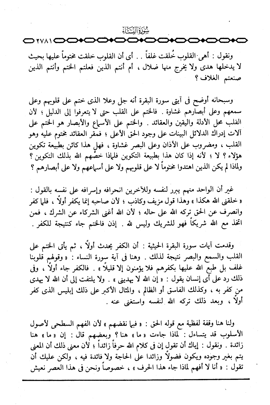 وقدمت آيات سورة البقرة الحيثية: أن الكفر يحدث أولاً، ثم يأتي الختم على القلب والسمع والبصر نتيجة لذلك. وهنا في آية سورة النساء: {وَقَوْلِهِمْ قُلُوبُنَا غُلْفٌ بَلْ طَبَعَ الله عَلَيْهَا بِكُفْرِهِمْ فَلاَ يُؤْمِنُونَ إِلاَّ قَلِيلاً} . فالكفر جاء أولاً، وفي ذلك رد على أي إنسان يقول: «إن الله لا يهديني» . ولا يلتفت إلى أن الله لا يهدي من كفر به، وكذلك الفاسق أو الظالم، والمثال الأكبر على ذلك إبليس الذي كفر أولاً. وبعد ذلك تركه الله لنفسه واستغنى عنه.