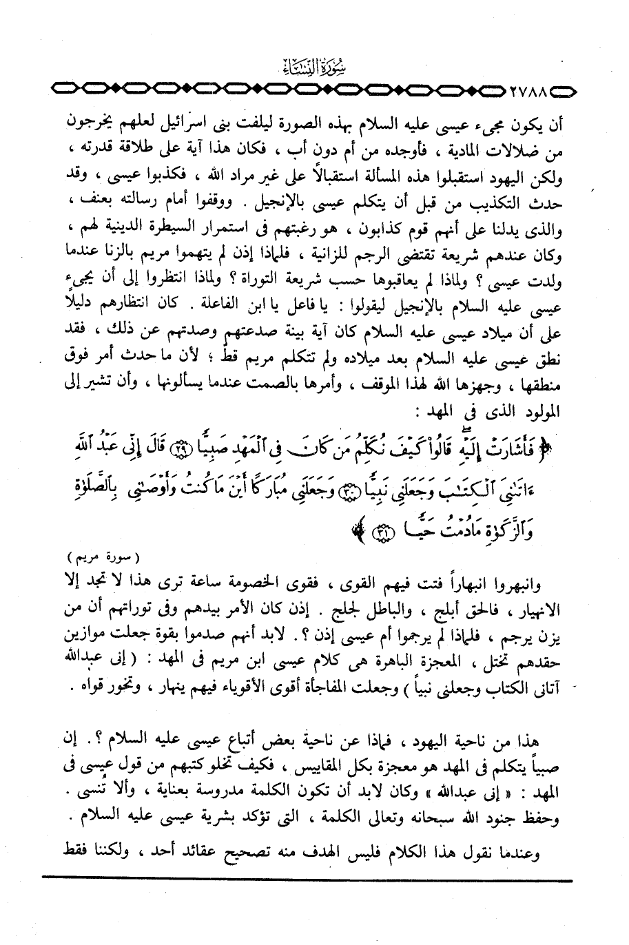 أن يكون مجيء عيسى عليه السلام بهذه الصورة ليلفت بني إسرائيل لعلهم يخرجون من ضلالات المادية، فأوجده من أم دون أب، فكان هذا آية على طلاقة قدرته، ولكن اليهود استقبلوا هذه المسألة استقبالاً على غير مراد الله، فكذبوا عيسى، وقد حدث التكذيب من قبل أن يتكلم عيسى بالانجيل. ووقفوا أمام رسالته بعنف، والذي يدلنا على أنهم قوم كذابون، هو رغبتهم في استمرار السيطرة الدينية لهم، وكان عندهم شريعة تقتضي الرجم للزانية، فلماذا إذن لم يتهموا مريم بالزنا عندما ولدت عيسى؟ ولماذا لم يعاقبوها حسب سريعة التوراة؟ ولماذا انتظروا إلى أن يجيء عيسى عليه السلام بالإنجيل ليقولوا: يا فاعل يا ابن الفاعلة. كان انتظارهم دليلاً على أن ميلاد عيسى عليه السلام كان آية بينة صدعتهم وصدتهم عن ذلك، فقد نطق عيسى عليه السلام بعد ميلاده ولم تتكلم مريم قطّ؛ لأن ما حدث أمر فوق منطقها، وجهزها الله لهذا الموقف؟ ، وأمرها بالصمت عندما يسألونها، وأن تشير إلى المولود الذي في المهد: {فَأَشَارَتْ إِلَيْهِ قَالُواْ كَيْفَ نُكَلِّمُ مَن كَانَ فِي المهد صَبِيّاً قَالَ إِنِّي عَبْدُ الله آتَانِيَ الكتاب وَجَعَلَنِي نَبِيّاً وَجَعَلَنِي مُبَارَكاً أَيْنَ مَا كُنتُ وَأَوْصَانِي بالصلاة والزكاة مَا دُمْتُ حَيّاً} [مريم: 29 - 31]