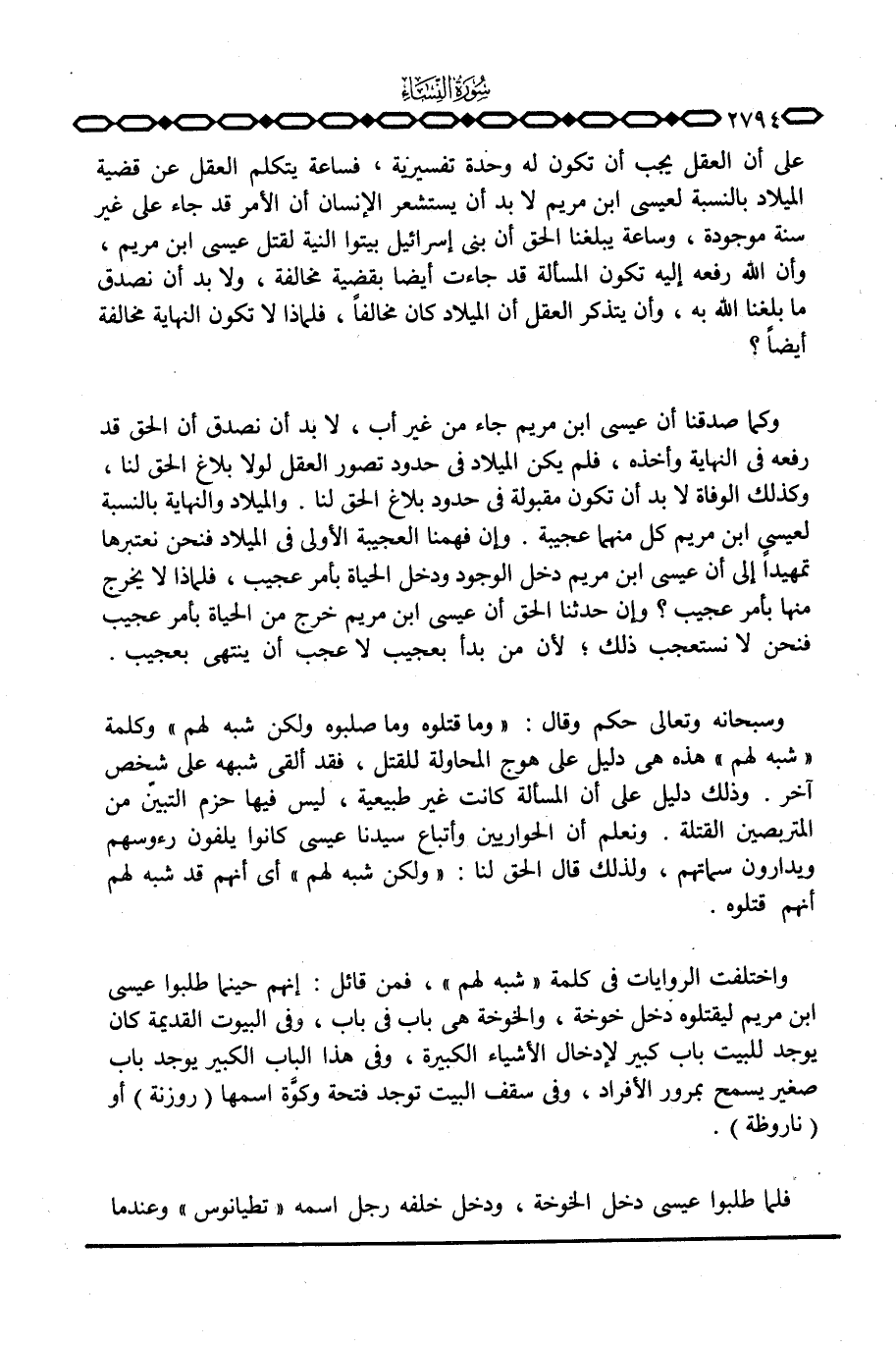 على أن العقل يجب أن تكون له وحدة تفسيرية، فساعة يتكلم العقل عن قضية الميلاد بالنسبة لعيسى ابن مريم لا بد أن يستشعر الإنسان أن الأمر قد جاء على غير سنة موجودة، وساعة يبلغنا الحق أن بني إسرائيل بيتوا النية لقتل عيسى ابن مريم، وأن الله رفعه إليه تكون المسألة قد جاءت أيضا بقضية مخالفة، ولا بد أن نصدق ما بلغنا الله به، وأن يتذكر العقل أن الميلاد كان مخالفاً، فلماذا لا تكون النهاية مخالفة أيضاً؟