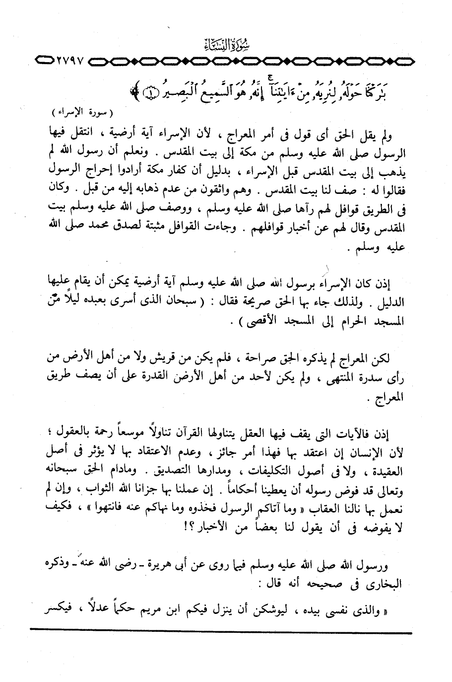 ولم يقل الحق أي قول في أمر المعراج، لأن الإسراء آية أرضية، انتقل فيها الرسول صَلَّى اللَّهُ عَلَيْهِ وَسَلَّم َ من مكة إلى بيت المقدس. ونعلم أن رسول الله لم يذهب إلى بيت المقدس قبل الإسراء، بدليل أن كفار مكة أرادوا إحراج الرسول فقالوا له: صف لنا بيت المقدس. وهم واثقون من عدم ذهابه إليه من قبل. وكان في الطريق قوافل لهم رآها صَلَّى اللَّهُ عَلَيْهِ وَسَلَّم َ، ووصف صَلَّى اللَّهُ عَلَيْهِ وَسَلَّم َ بيت المقدس وقال لهم عن أخبار قوافلهم. وجاءت القوافل مثبتة لصدق محمد صَلَّى اللَّهُ عَلَيْهِ وَسَلَّم َ.