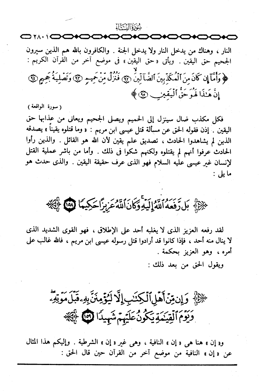 فكل مكذب ضال سينزل إلى الحميم ويصلى الجحيم ويعاني من عذابها حق اليقين. إذن فقوله الحق عن مسألة قتل عيسى ابن مريم: {وَمَا قَتَلُوهُ يَقِيناً} يصدقه الذين لم يشاهدوا الحادث، تصديق علم يقين لأن الله هو القائل. والذين رأوا الحادث عرفوا أنهم لم يقتلوه ولكنهم شكوا في ذلك. وأما من باشر عملية القتل لإنسان غير عيسى عليه السلام فهو الذي عرف حقيقة اليقين. والذي حدث هو ما يلي: {بَل رَّفَعَهُ الله ... }