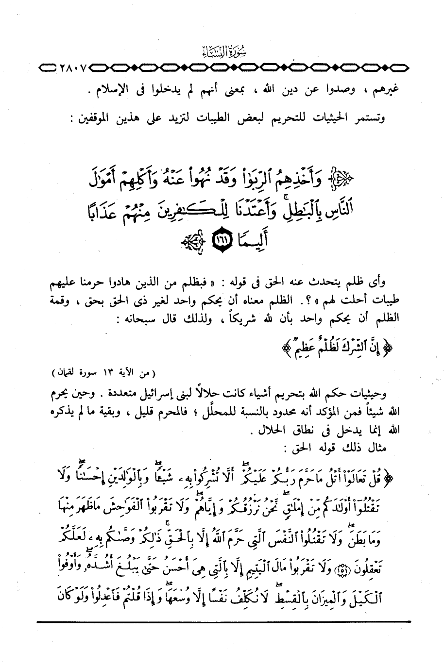 مثال ذلك قوله الحق: {قُلْ تَعَالَوْاْ أَتْلُ مَا حَرَّمَ رَبُّكُمْ عَلَيْكُمْ أَلاَّ تُشْرِكُواْ بِهِ شَيْئاً وبالوالدين إِحْسَاناً وَلاَ تقتلوا أَوْلاَدَكُمْ مِّنْ إمْلاَقٍ نَّحْنُ نَرْزُقُكُمْ وَإِيَّاهُمْ وَلاَ تَقْرَبُواْ الفواحش مَا ظَهَرَ مِنْهَا وَمَا بَطَنَ وَلاَ تَقْتُلُواْ النفس التي حَرَّمَ الله إِلاَّ بالحق ذلكم وَصَّاكُمْ بِهِ لَعَلَّكُمْ تَعْقِلُونَ وَلاَ تَقْرَبُواْ مَالَ اليتيم إِلاَّ بالتي هِيَ أَحْسَنُ حتى يَبْلُغَ أَشُدَّهُ وَأَوْفُواْ الكيل والميزان بالقسط لاَ نُكَلِّفُ نَفْساً إِلاَّ وُسْعَهَا وَإِذَا قُلْتُمْ فاعدلوا وَلَوْ كَانَ
