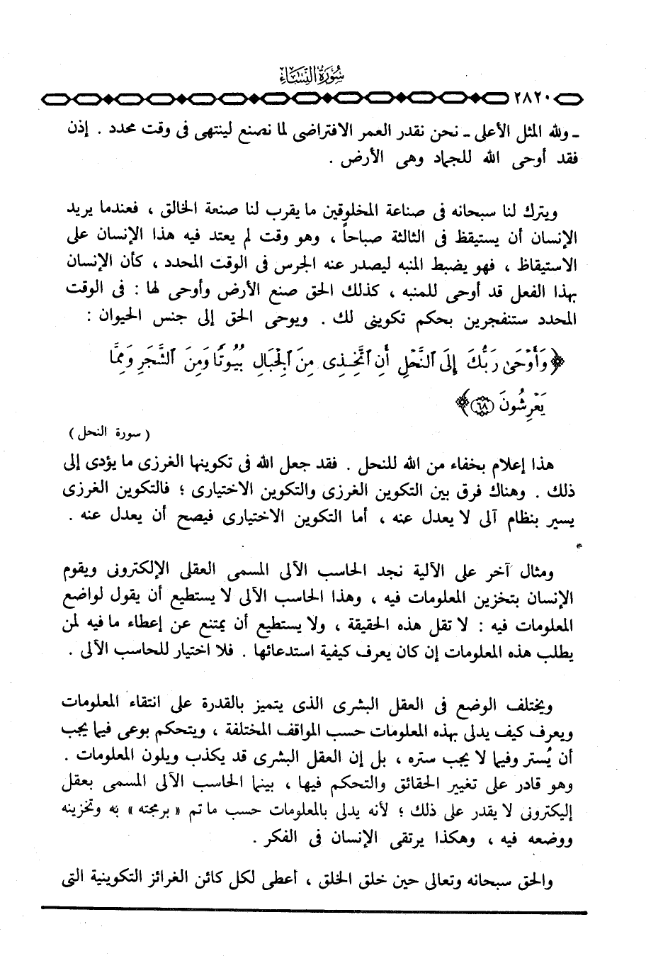 ويترك لنا سبحانه في صناعة المخلوقين ما يقرب لنا صنعة الخالق، فعندما يريد الإنسان أن يستيقظ في الثالثة صباحاً، وهو وقت لم يعتد فيه هذا الإنسان على الاستيقاظ، فهو يضبط المنبه ليصدر عنه الجرس في الوقت المحدد، كأن الإنسان بهذا الفعل قد أوحى للمنبه، كذلك الحق صنع الأرض وأوحى لها: في الوقت المحدد ستنفجرين بحكم تكويني لك. ويوحي الحق إلى جنس الحيوان: {وأوحى رَبُّكَ إلى النحل أَنِ اتخذي مِنَ الجبال بُيُوتاً وَمِنَ الشجر وَمِمَّا يَعْرِشُونَ} [النحل: 68]