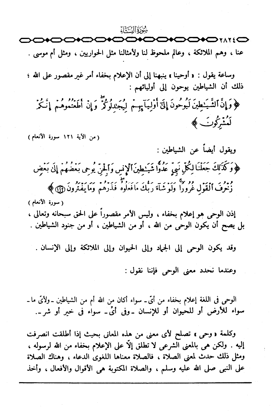 وكلمة «وحي» تصلح لأي معنى من هذه المعاني بحيث إذا أطلقت انصرفت إليه. ولكن هي بالمعنى الشرعي لا تطلق إلاّ على الإعلام بخفاء من الله لرسوله، ومثل ذلك حدث لمعنى الصلاة، فالصلاة معناها اللغوي الدعاء، وهناك الصلاة على النبي صَلَّى اللَّهُ عَلَيْهِ وَسَلَّم َ، والصلاة المكتوبة هي الأقوال والأفعال، وأخذ