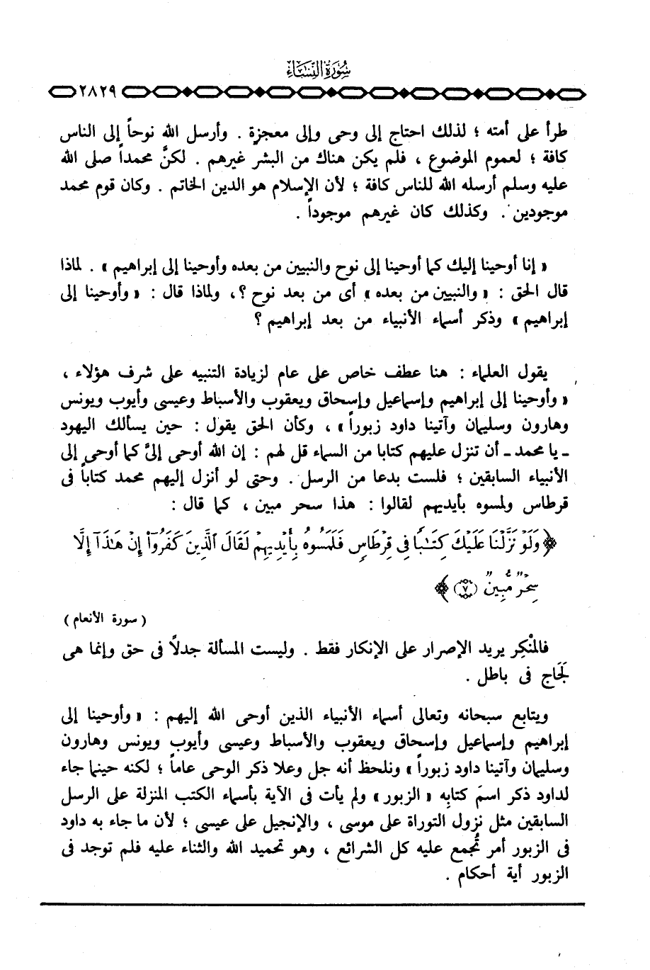 يقول العلماء: هنا عطف خاص على عام لزيادة التنبيه على شرف هؤلاء، {وَأَوْحَيْنَآ إلى إِبْرَاهِيمَ وَإِسْمَاعِيلَ وَإسْحَاقَ وَيَعْقُوبَ والأسباط وعيسى وَأَيُّوبَ وَيُونُسَ وَهَارُونَ وَسُلَيْمَانَ وَآتَيْنَا دَاوُودَ زَبُوراً} ، وكأن الحق يقول: حين يسألك اليهود - يا محمد - أن تنزل عليهم كتابا من السماء قل لهم: إن الله أوحى إليَّ كما أوحى إلى ألأنبياء السابقين؛ فلست بدعا من الرسل. وحتى لو أنزل إليهم محمد كتاباً في قرطاس ولمسوه بأيديهم لقالوا: هذا سحر مبين، كما قال: {وَلَوْ نَزَّلْنَا عَلَيْكَ كِتَاباً فِي قِرْطَاسٍ فَلَمَسُوهُ بِأَيْدِيهِمْ لَقَالَ الذين كَفَرُواْ إِنْ هاذآ إِلاَّ سِحْرٌ مُّبِينٌ} [الأنعام: 7]