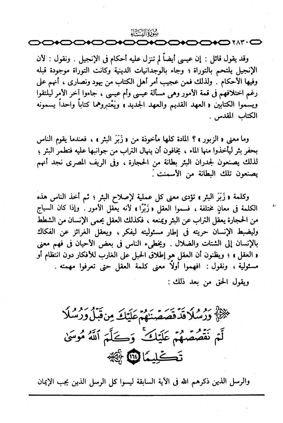 وقد يقول قائل: إن عيسى أيضاً لم تنزل عليه أحكام في الإنجيل. ونقول: لأن الإنجيل يلتحم بالتوراة؛ وجاء بالوجدانيات الدينية وكانت التوراة موجودة قبله وفيها الأحكام. ولذلك فمن عجيب أمر أهل الكتاب من يهود ونصارى، أنهم على رغم اختلافهم في قمة الأمور وهي مسألة عيسى وأم عيسى، جاءوا آخر الأمر ليلتقوا ويسموا الكتابين «العهد القديم والعهد الجديد» ويَعْتبروهما كتاباً واحداً يسمونه الكتاب المقدس.