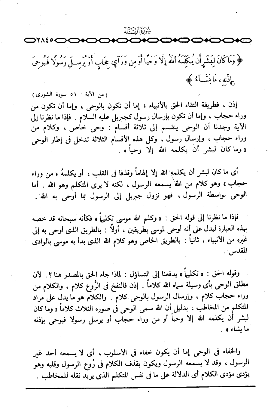 {وَمَا كَانَ لِبَشَرٍ أَن يُكَلِّمَهُ الله إِلاَّ وَحْياً أَوْ مِن وَرَآءِ حِجَابٍ أَوْ يُرْسِلَ رَسُولاً فَيُوحِيَ بِإِذْنِهِ مَا يَشَآءُ إِنَّهُ عَلِيٌّ حَكِيمٌ} [الشورى: 51]
