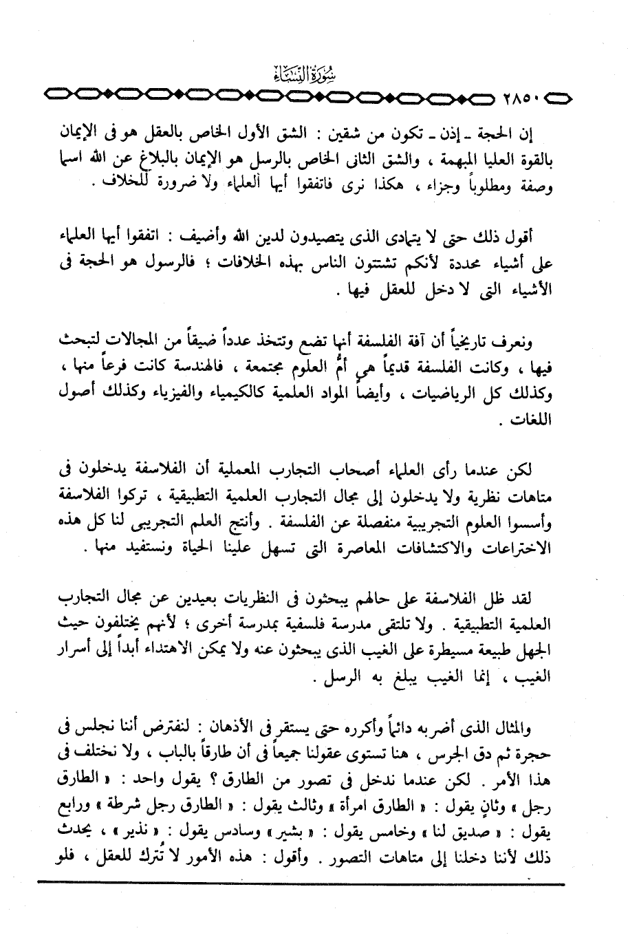 إن الحجة - إذن - تكون من شقين: الشق الأول الخاص بالعقل هو في الإيمان بالقوة العليا المبهمة، والشق الثاني الخاص بالرسل هو الإيمان بالبلاغ عن الله اسما وصفة ومطلوباً وجزاء، وهكذا نرى فاتفقوا أيها العلماء ولا ضرورة للخلاف.