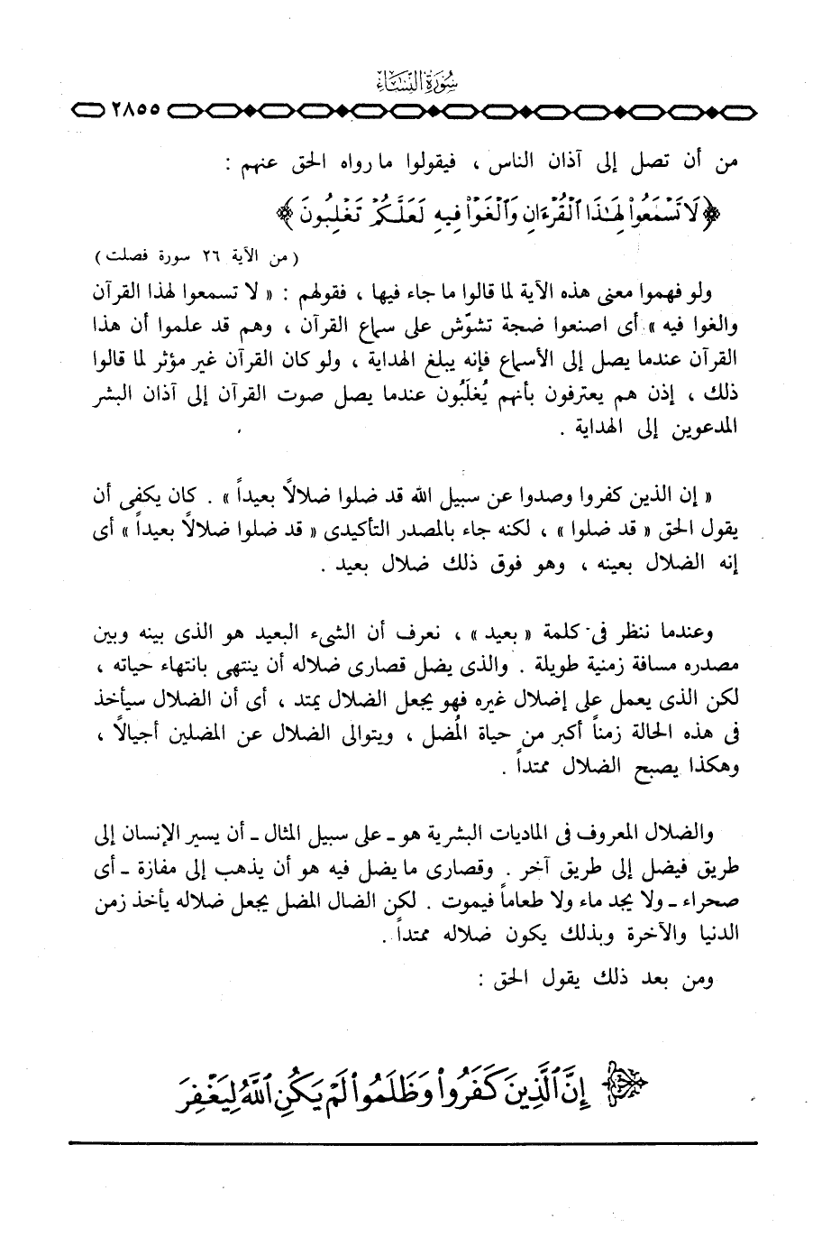 {إِنَّ الذين كَفَرُواْ وَصَدُّواْ عَن سَبِيلِ الله قَدْ ضَلُّواْ ضلالا بَعِيداً} . كان يكفي أن يقول الحق {قَدْ ضَلُّواْ} ، لكنه جاء بالمصدر التأكيدي {قَدْ ضَلُّواْ ضلالا بَعِيداً} أي إنه الضلال بعينه، وهو فوق ذلك ضلال بعيد.