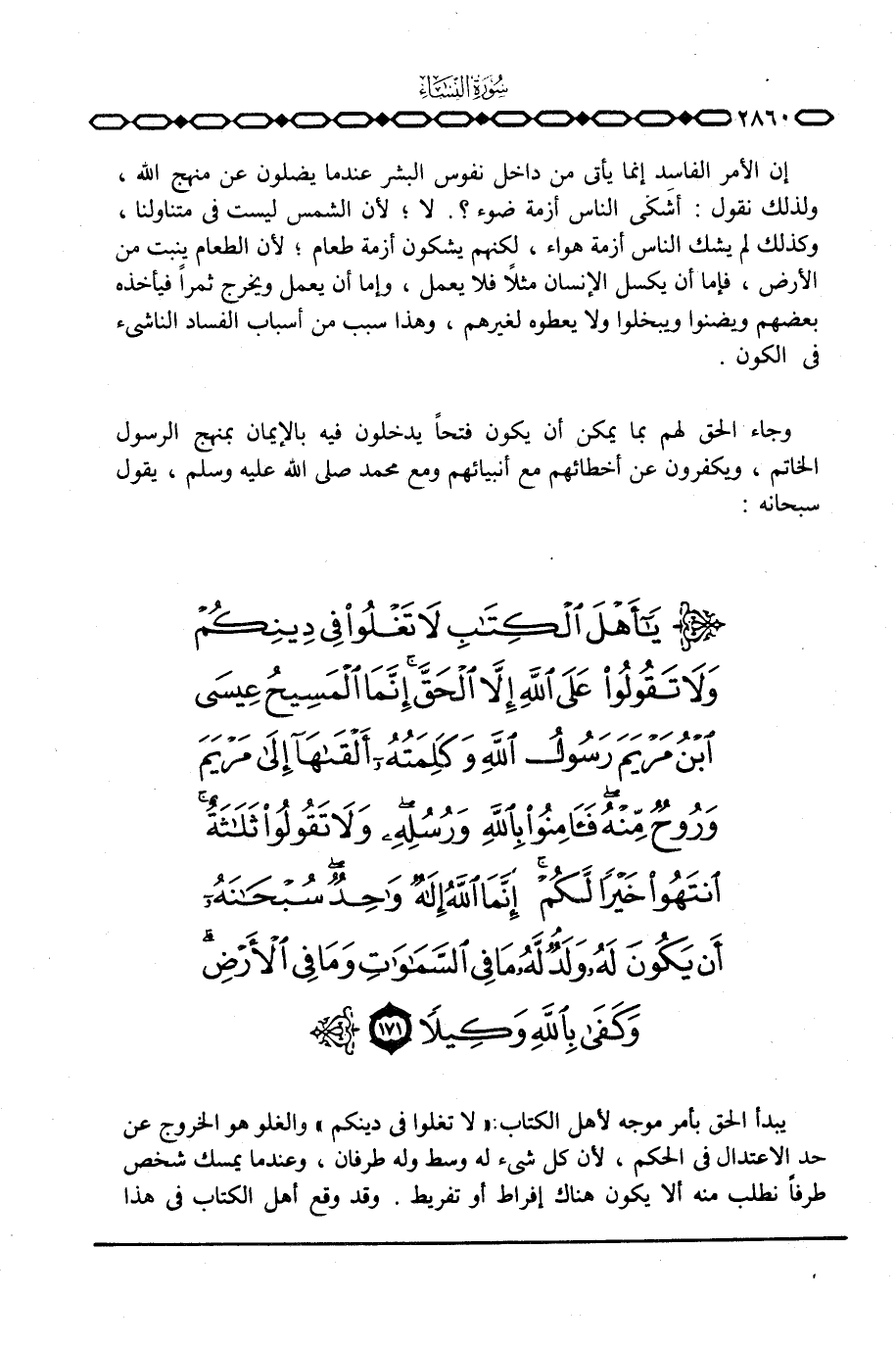 يبدأ الحق بأمر موجه لأهل الكتاب: {لاَ تَغْلُواْ فِي دِينِكُمْ} والغلو هو الخروج عن حد الاعتدال في الحكم، لأن كل شيء له وسط وله طرفان، وعندما يمسك شخص طرفاً نطلب منه ألا يكون هناك إفراط أو تفريط. وقد وقع أهل الكتاب في هذا