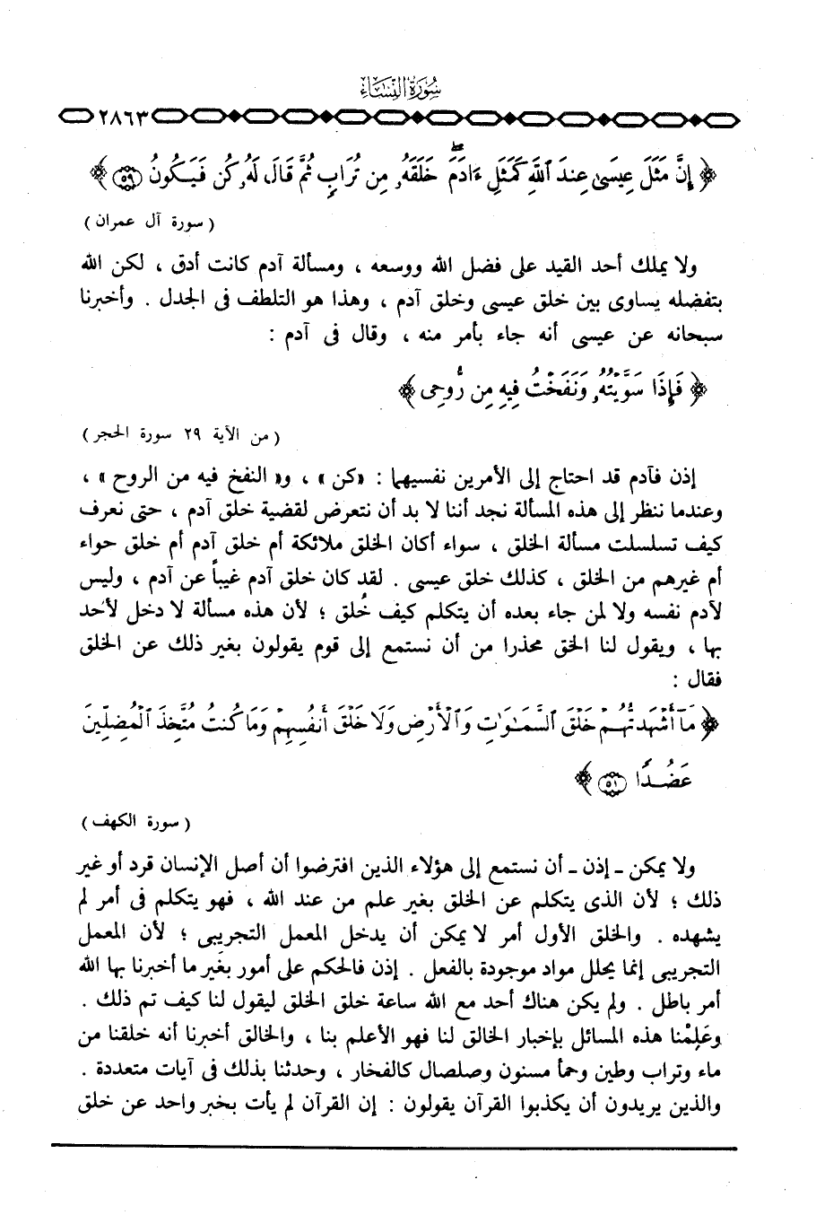 إذن فآدم قد احتاج إلى الأمرين نفسيهما: «كن» ، و «النفخ فيه من الروح» ، وعندما ننظر إلى هذه المسألة نجد أننا لا بد أن نتعرض لقضية خلق آدم، حتى نعرف كيف تسلسلت مسألة الخلق، سواء أكان الخلق ملائكة أم خلق آدم أم خلق حواء أو غيرهم من الخلق، كذلك خلق عيسى. لقد كان خلق آدم غيباً عن آدم، وليس لآدم نفسه ولا لمن جاء بعده أن يتكلم كيف خُلق؛ لأن هذه المسألة لا دخل لأحد بها، ويقول لنا الخلق محذرا من أن نستمع إلى قوم يقولون بغير ذلك عن الخلق فقال: {مَّآ أَشْهَدتُّهُمْ خَلْقَ السماوات والأرض وَلاَ خَلْقَ أَنْفُسِهِمْ وَمَا كُنتُ مُتَّخِذَ المضلين عَضُداً} [الكهف: 51]