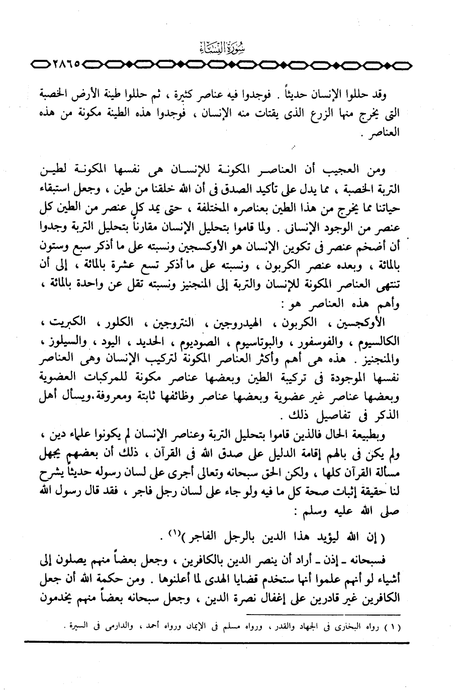 وبطبيعة الحال فالذين قاموا بتحليل التربة وعناصر الإنسان لم يكونوا علماء دين، ولم يكن في بالهم إقامة الدليل على صدق الله في القرآن، ذلك أن بعضهم يجهل مسألة القرآن كلها، ولكن الحق سبحانه وتعالى أجرى على لسان رسوله حديثاً يشرح لنا حقيقة إثبات صحة كل ما فيه ولو جاء على لسان رجل فاجر، فقد قال رسول الله صَلَّى اللَّهُ عَلَيْهِ وَسَلَّم َ: