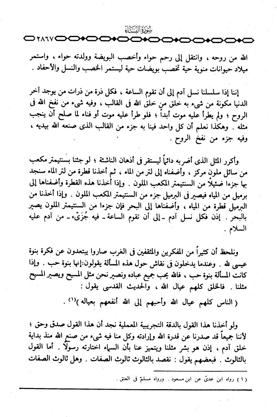 إننا إذا سلسلنا نسل آدم إلى أن تقوم الساعة، فكل ذرة من ذرات من يوجد آخر الدنيا مكونة من شيء به خلق من خلق الله في القالب، وفيه شيء من نفخ الله في الروح؛ ولم يطرأ عليه موت أبداً؛ فلو طرأ عليه موت أو فناء لما صلح أن ينجب مثله. وهكذا نعلم أن كل واحد فينا به جزء من القالب الذي صنعه الله بيديه، وفيه جزء من نفخ الروح.