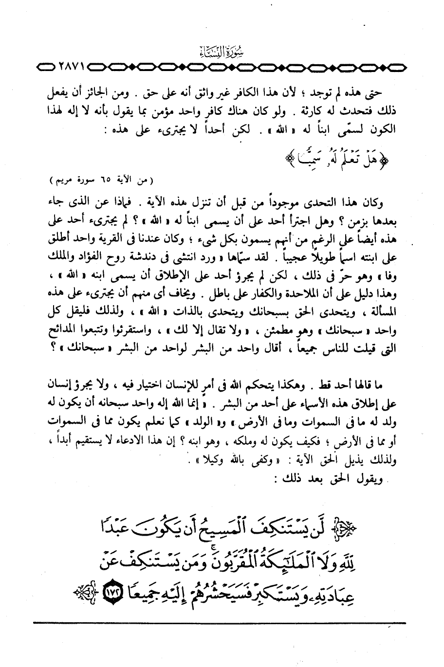 وكان هذا التحدي موجوداً من قبل أن تنزل هذه الآية. فماذا عن الذي جاء بعدها بزمن؟ وهل اجترأ أحد على أن يسمي ابناً له «الله» ؟ لم يجترئ أحد على هذه أيضاً على الرغم من أنهم يسمون بكل شيء؛ وكان عندنا في القرية واحد أطلق على ابنته اسماً طويلاً عجيباً. لقد سمّاها «ورد انتشي في دندشة روح الفؤاد والملك وفا» وهو حرّ في ذلك، لكن لم يجرؤ أحد على الإطلاق أن يسمي ابنه «الله» ، وهذا دليل على أن الملاحدة والكفار على باطل. ويخاف أي منهم أن يجترئ على هذه المسألة، ويتحدى الحق بسبحانك ويتحدى بالذات «الله» ، ولذلك فليقل كل واحد «سبحانك» وهو مطمئن، «ولا تقال إلا لك» ، واستقرئوا وتتبعوا المدائح التي قيلت للناس جميعاً، أقال واحد من البشر لواحد من البشر «سبحانك» ؟