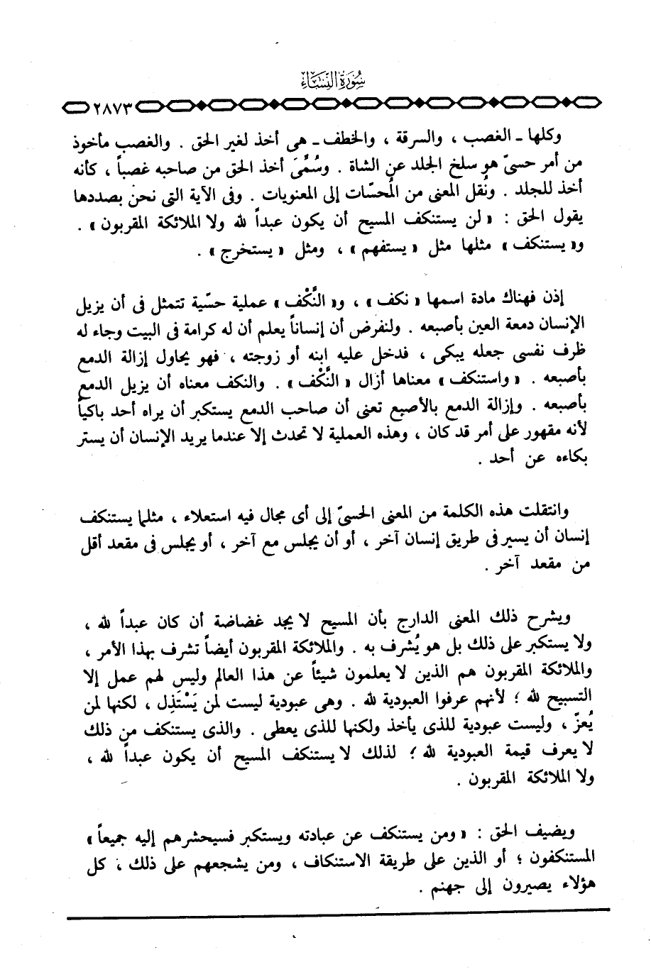 وكلها - الغصب، والسرقة، والخطف - هي أخذ لغير الحق، والغصب مأخوذ من امر حسيّ هو سلخ الجلد عن الشاة. وسُمِّيَ أخذ الحق من صاحبه غصباً، كأنه أخذ للجلد. ونُقل المعنى من المُحسّات إلى المعنويات. وفي الآية التي نحن بصددها يقول الحق: {لَّن يَسْتَنكِفَ المسيح أَن يَكُونَ عَبْداً للَّهِ وَلاَ الملائكة المقربون} . و «يستنكف» مثلها مثل «يستفهم» ، ومثل «يستخرج» .