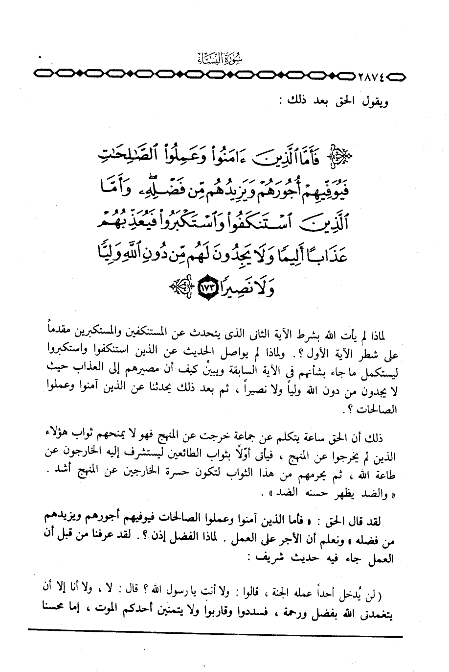 لماذا لم يأت الله بشرط الآية الثاني الذي يتحدث عن المستنكفين والمستكبرين مقدماً على شطر الآية الأول؟ . ولماذا لم يواصل الحديث عن الذين استنكفوا واستكبروا ليستكمل ما جاء بشأنهم في الآية السابقة ويبينْ كيف أن مصيرهم إلى العذاب حيث لا يجدون من دون الله ولياً ولا نصيراً، ثم بعد ذلك يحدثنا عن الذين آمنوا وعملوا الصالحات؟ .