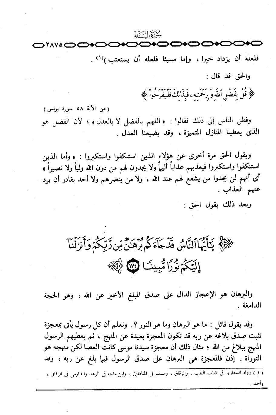 وقد يقول قائل: ما هو البرهان وما هو النور؟ . ونعلم أن كل رسول يأتي بمعجزة تثبت صدق بلاغه عن ربه قد تكون المعجزة بعيدة عن المنهج، ثم يعطيهم الرسول المنهج ببلاغ من الله؛ مثال ذلك أن معجزة سيدنا موسى كانت العصا لكن منهجه هو التوراة. إذن فالمعجزة هي البرهان على صدق الرسول فيما بلغ عن ربه، وقد