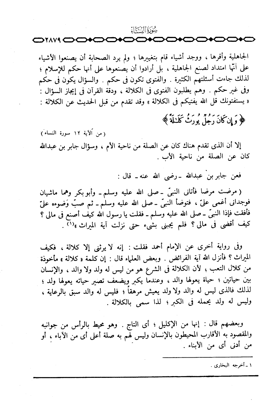 وفي رواية أخرى عن الإمام أحمد فقلت: إنه لا يرثني إلا كلالة، فكيف الميراث؟ فأنزل الله آية الفرائض. وبعض العلماء قال: إن كلمة» كلالة «مأخوذة من كلال التعب؛ لأن الكلالة في الشرع هو من ليس له ولد ولا والد، والإنسان بين حياتين؛ حياة يعولها والد، وعندما يكبر ويضعف تصير حياته يعولها ولد؛ لذلك فالذي ليس له والد ولا ولد يعيش مرهقاً؛ فليس له والد سبق بالرعاية، وليس له ولد يحمله في الكبر؛ لذا سمي بالكلالة.