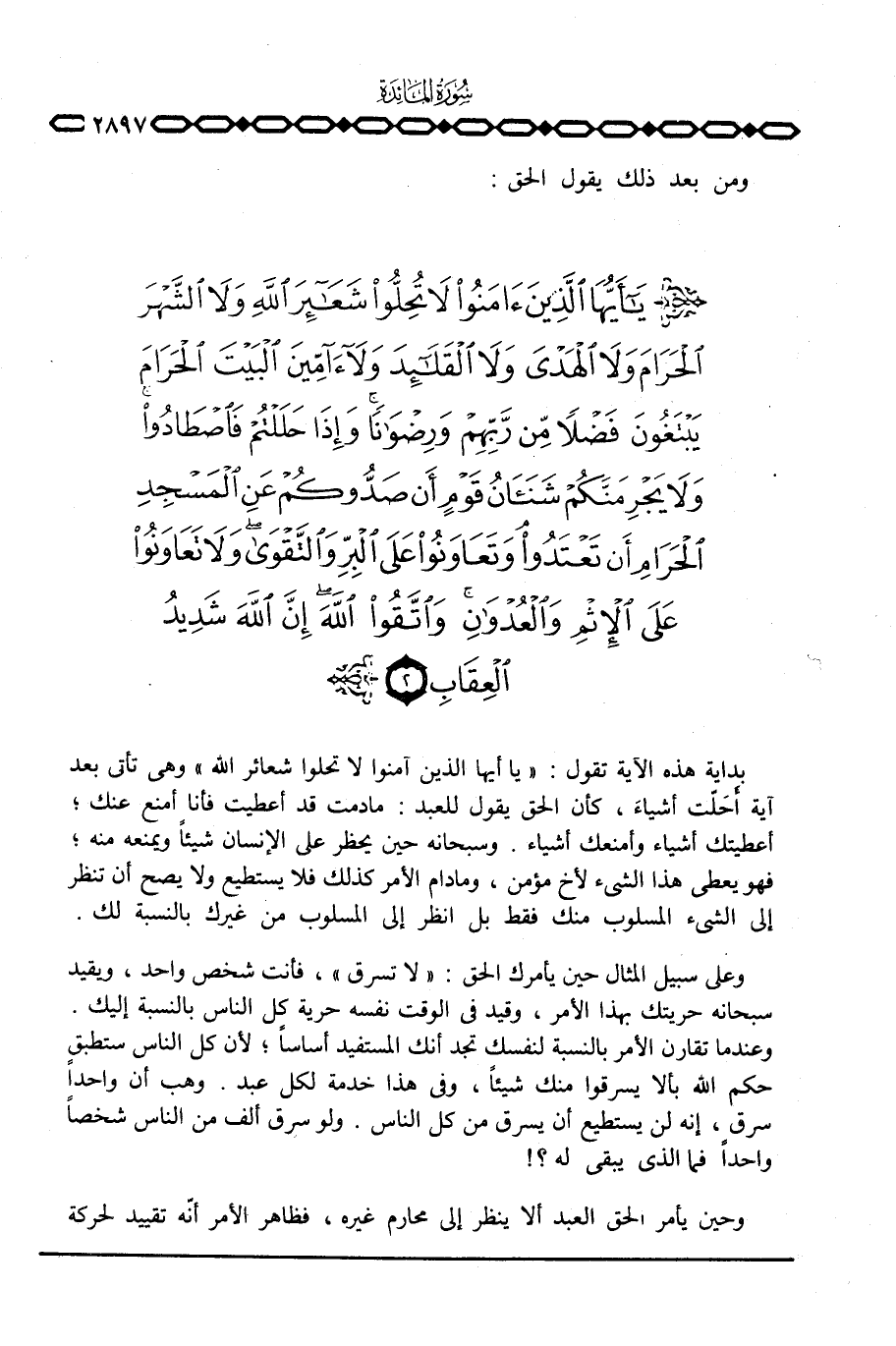بداية هذه الآية تقول: {يَا أَيُّهَا الذين آمَنُواْ لاَ تُحِلُّواْ شَعَآئِرَ الله} وهي تأتي بعد آية اَحَلّت أشياءَ، كأن الحق يقول للعبد: مادمت قد أعطيت فأنا أمنع عنك؛ أعطيتك أشياء وأمنعك أشياء. وسبحانه حين يخطر على الإنسان شيئاً ويمنعه منه؛ فهو يعطي هذا الشيء لأخ مؤمن، ومادام الأمر كذلك فلا يستطيع ولا يصح أن تنظر إلى الشيء المسلوب منك فقط بل انظر إلى المسلوب من غيرك بالنسبة لك.
