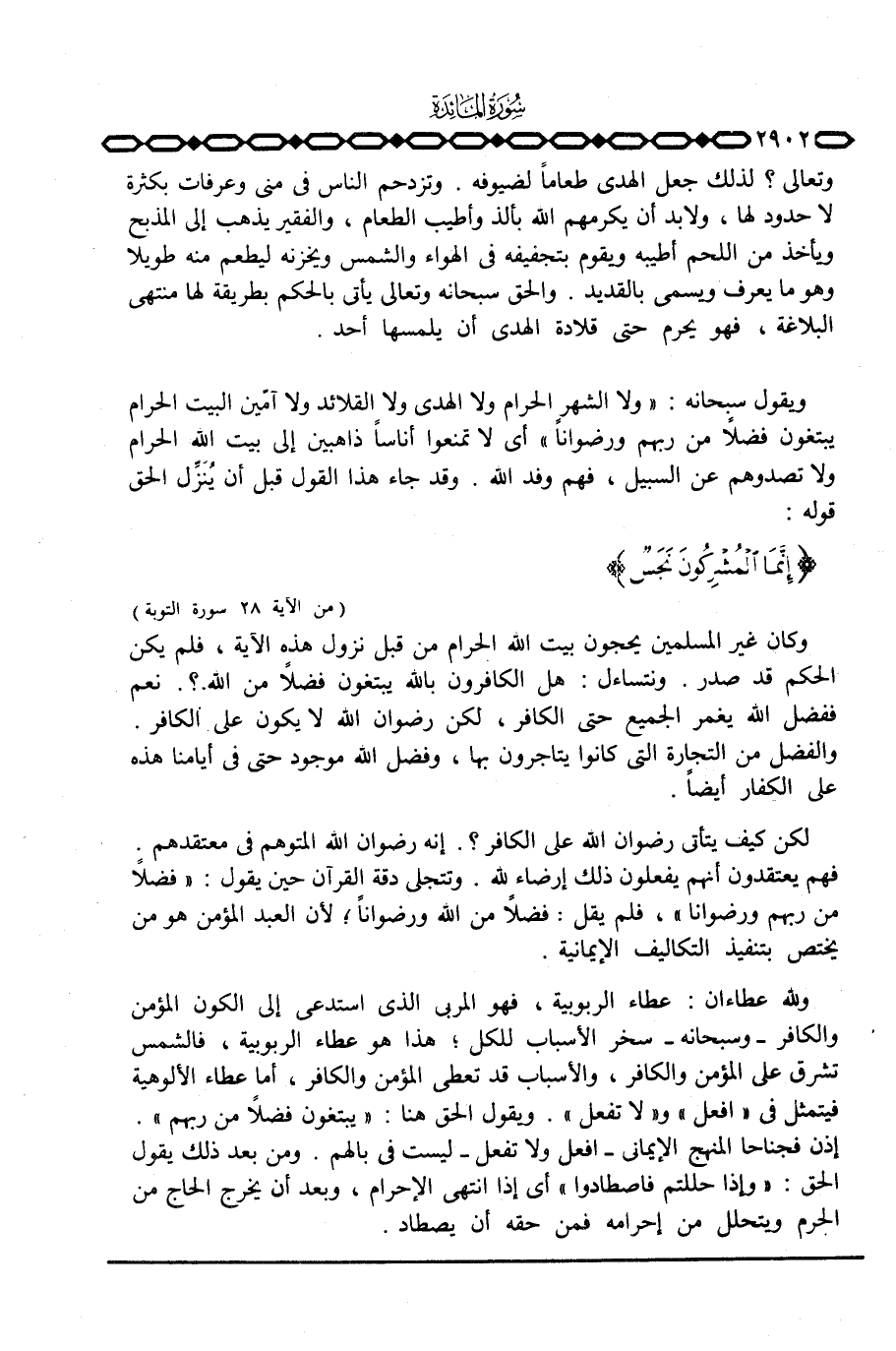 وكان غير المسلمين يحجون بيت الله الحرام من قبل نزول هذه الآية، فلم يكن الحكم قد صدر. ونتساءل: هل الكافرون بالله يبتغون فضلاً من الله؟ . نعم ففضل الله يغمر الجميع حتى الكافر، لكن رضوان الله لا يكون على الكافر.