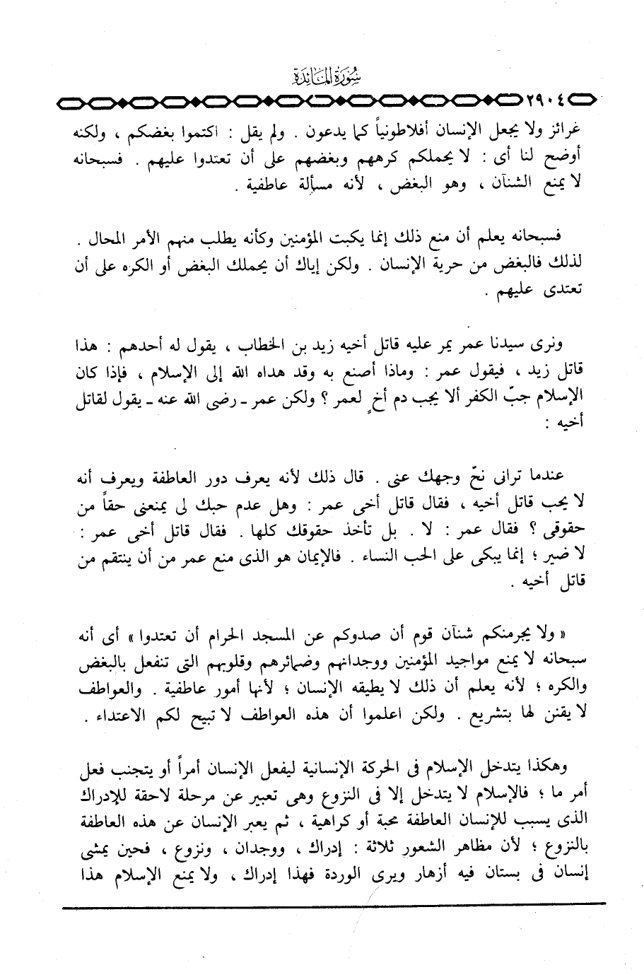 غرائز ولا يجعل الإنسان أفلاطونياً كما يدعون. ولم يقل: اكتموا بغضكم، ولكنه أوضح لنا أي: لا يحملكم كرههم وبغضهم على أن تعتدوا عليهم. فسبحانه لا يمنع الشنآن، وهو البغض، لأنه مسألة عاطفية.