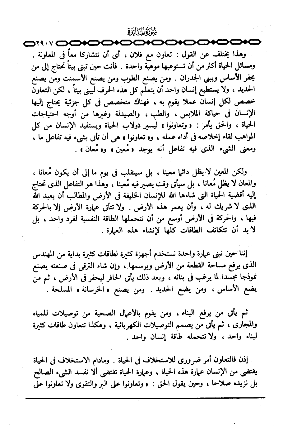 ومن يصنع الطوب ومن يصنع الأسمنت ومن يصنع الحديد، ولا يستطيع إنسان واحد أن يتعلم كل هذه الحرف ليبني بيتاً. لكن التعاون خصص لكل إنسان عملا يقوم به، فهناك متخصص في كل جزئية يحتاج إليها الإنسان في حياكة الملابس، والطب، والصيدلة وغيرها من أوجه احتياجات الحياة، والحق يأمر: «وتعاونوا» ليسير دولاب الحياة ويستفيد الإنسان من كل المواهب لقاء إخلاصه في أداء عمله، و «تعاونوا» هي أن تأتي بشيء فيه تفاعل ما، ومعنى الشيء الذي فيه تفاعل أنه يوجد «مُعين» و «مُعان» .