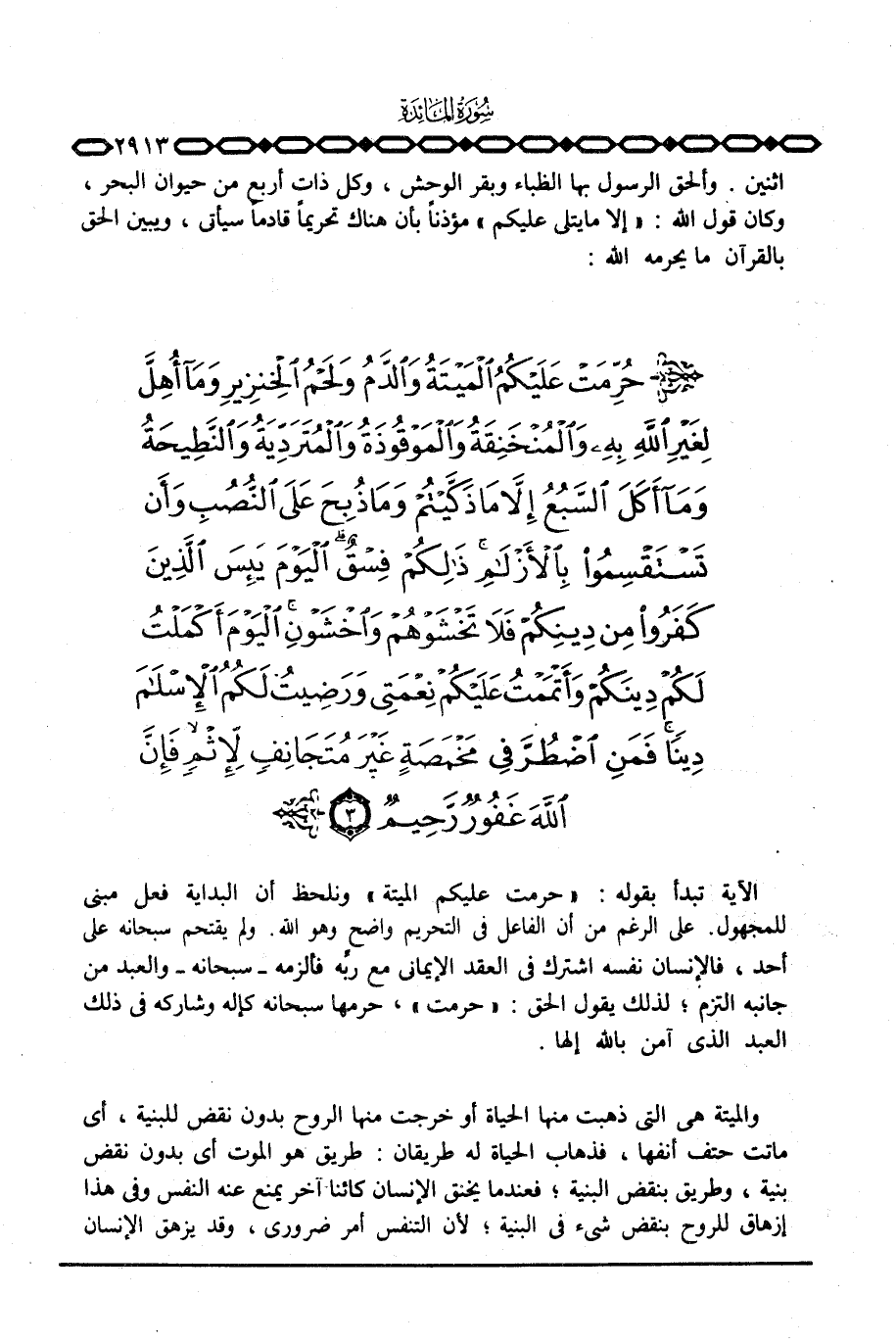 الآية تبدأ بقوله: {حُرِّمَتْ عَلَيْكُمُ الميتة} ونلحظ أن البداية فعل مبني للمجهول. على الرغم من أن الفاعل في التحريم واضح وهو الله. ولم يقتحم سبحانه على أحد، فالإنسان نفسه اشترك في العقد الإيماني مع ربِّه فألزمه - سبحانه - والعبد من جانبه التزم؛ لذلك يقول الحق: «حرمت» ، حرمها سبحانه كإله وشاركه في ذلك العبد الذي آمن بالله إلها.