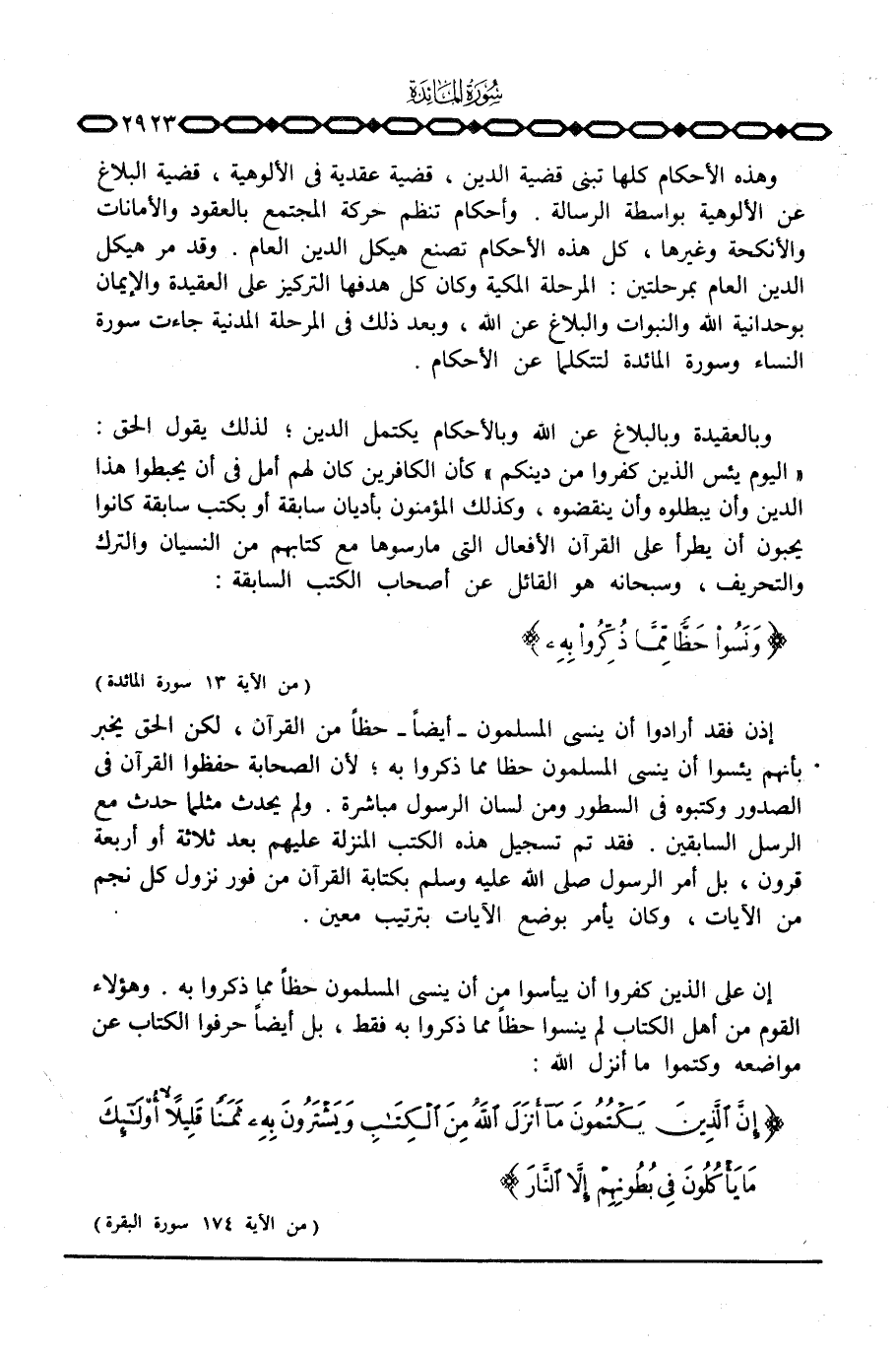 وهذه الأحكام كلها تبني قضية الدين، قضية عقدية في الألوهية، قضية البلاغ عن الألوهية بواسطة الرسالة. وأحكام تنظم حركة المجتمع بالعقود والأمانات والأنكحة وغيرها، كل هذه الأحكام تصنع هيكل الدين العام. وقد مر هيكل الدين العام بمرحلتين: المرحلة المكية وكان كل هدفها التركيز على العقيدة والإيمان بوحدانية الله والنبوات والبلاغ عن الله، وبعد ذلك في المرحلة المدنية جاءت سورة النساء وسورة المائدة لتتكلما عن الأحكام.