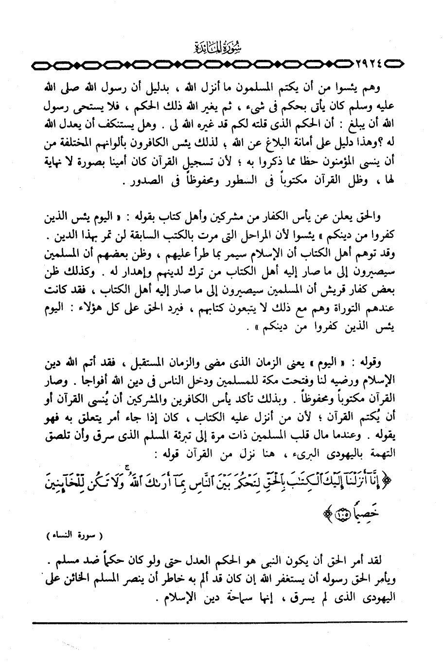وقوله: «اليوم» يعني الزمان الذي مضى والزمان المستبقل، فقد أتم الله دين الإسلام ورضيه لنا وفتحت مكة للمسلمين ودخل الناس في دين الله أفواجا. وصار القرآن مكتوباً ومحفوظاً. وبذلك تأكد يأس الكافرين والمشركين أن يُنسى القرآن أو أن يُكتم القرآن؛ لأن من أنزل عليه الكتاب، كان إذا جاء أمر يتعلق به فهو يقوله. وعندما مال قلب المسلمين ذات مرة إلى تبرئة المسلم الذي سرق وأن تلصق التهمة باليهودي البريء، هنا نزل من القرآن قوله: {إِنَّآ أَنْزَلْنَا إِلَيْكَ الكتاب بالحق لِتَحْكُمَ بَيْنَ الناس بِمَآ أَرَاكَ الله وَلاَ تَكُنْ لِّلْخَآئِنِينَ خَصِيماً} [النساء: 105]