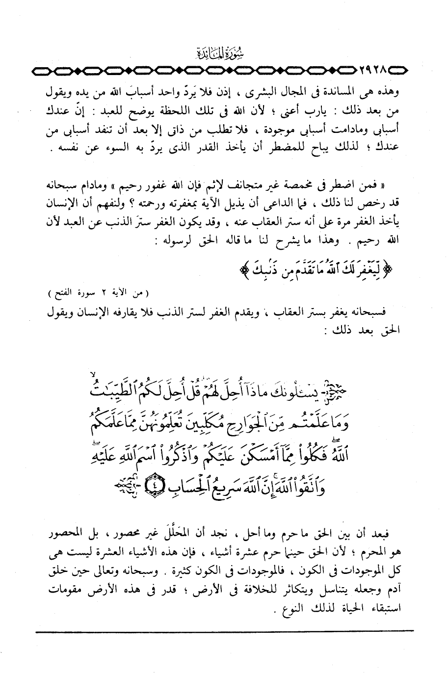 فبعد أن بين الحق ما حرم وما أحل، نجد أن المحَلَّلَ غير محصور، بل المحصور هو المحرم؛ لأن الحق حرم عشرة أشياء، فإن هذه الأشياء العشرة ليست هي كل الموجودات في الكون، فالموجودات في الكون كثيرة. وسبحانه وتعالى حين خلق آدم وجعله يتناسل ويتكاثر للخلافة في الأرض؛ قدر في هذه الأرض مقومات استبقاء الحياة لذلك النوع.