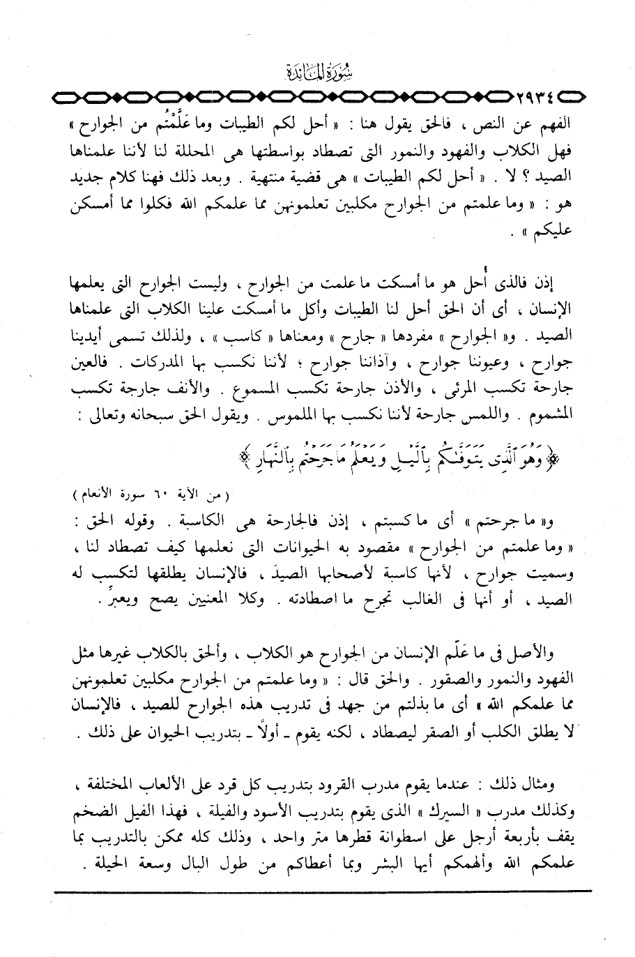 الفهم عن النص، فالحق يقول هنا: {قُلْ أُحِلَّ لَكُمُ الطيبات وَمَا عَلَّمْتُمْ مِّنَ الجوارح} فهل الكلاب والفهود والنمور التي تصطاد بواسطتها هي المحللة لنا لأننا علمناها الصيد؟ لا. {قُلْ أُحِلَّ لَكُمُ الطيبات} هي قضية منتهية. وبعد ذلك فهنا كلام جديد هو: {وَمَا عَلَّمْتُمْ مِّنَ الجوارح مُكَلِّبِينَ تُعَلِّمُونَهُنَّ مِمَّا عَلَّمَكُمُ الله فَكُلُواْ مِمَّآ أَمْسَكْنَ عَلَيْكُمْ} .