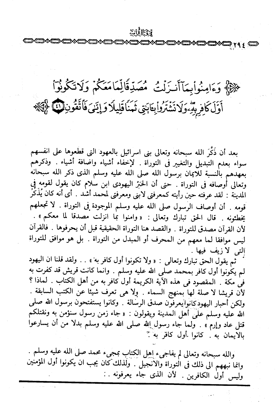 ثم يقول الحق تبارك وتعالى: {وَلاَ تكونوا أَوَّلَ كَافِرٍ بِهِ} . . ولقد قلنا أن اليهود لم يكونوا أول كافر بمحمد صَلَّى اللَّهُ عَلَيْهِ وَسَلَّم َ. وإنما كانت قريش قد كفرت به في مكة. المقصود في هذه الآية الكريمة أول كافر به من أهل الكتاب. لماذا؟ لأن قريشا لا صلة لها بمنهج السماء. ولا هي تعرف شيئا عن الكتب السابقة. ولكن أحبار اليهود كانوا يعرفون صدق الرسالة. وكانوا يستفتحون برسول الله صَلَّى اللَّهُ عَلَيْهِ وَسَلَّم َ على أهل المدينة ويقولون: «جاء زمن رسول سنؤمن به ونقتلكم قتل عاد وإرم» . ولما جاء رسول الله صَلَّى اللَّهُ عَلَيْهِ وَسَلَّم َ بدلا من أن يسارعوا بالإيمان به. كانوا أول كافر به.