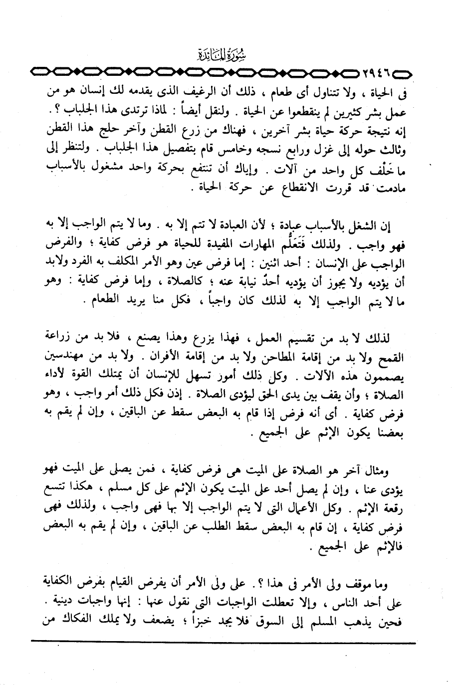 لذلك لا بد من تقسيم العمل، فهذا يزرع وهذا يصنع، فلا بد من زراعة القمح ولا بد من إقامة المطاحن ولا بد من إقامة الأفران. ولا بد من مهندسين يصممون هذه الآلات. وكل ذلك أمور تسهل للإنسان أن يمتلك القوة لأداء الصلاة؛ وأن يقف بين يدي الحق ليؤدي الصلاة. إذن فكل ذلك أمر واجب، وهو فرض كفاية. أي أنه فرض إذا قام به البعض سقط عن الباقين، وإن لم يقم به بعضنا يكون الإثم على الجميع.