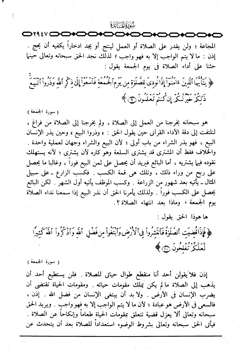 هو سبحانه يخرجنا من العمل إلى الصلاة، ولم يخرجنا إلى الصلاة من فراغ، لنلتفت إلى دقة الأداء القرآني حين يقول الحق: {وَذَرُواْ البيع} وحين يذر الإنسان البيع، فهو يذر الشراء من باب أولى؛ لأن البيع والشراء وجهان لعملية واحدة. والخلاف فقط أن المشتري قد يشتري السلعة وهو كاره لأن يشتري؛ لأنه يستهلك نقوده فيما يشتريه، أما البائع فيريد أن يحصل على ثمن البيع فوراً، وغالبا ما يحصل على ربح من وراء ذلك، وتلك هي قمة الكسب. فكسب الزارع - على سبيل المثال - يأتيه بعد شهور من الزراعة. وكسب الموظف يأتيه أول الشهر. لكن البائع يحصل على الكسسب فوراً. ولذلك يأمرنا الحق أن نذر البيع إذا سمعنا نداء الصلاة يوم الجمعة، وماذا بعد انتهاء الصلاة؟ .