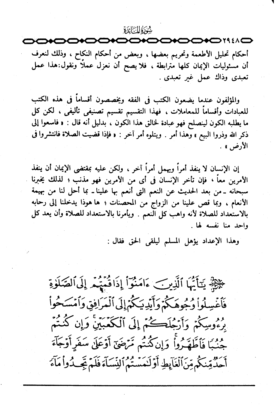 إن الإنسان لا ينفذ أمراً ويهمل أمراً آخر، ولكن عليه بمقتضى الإيمان أن ينفذ الأمرين معاً، فإن تأخر الإنسان في أي من الأمرين فهو مذنب؛ لذلك يخبرنا سبحانه - من بعد الحديث عن النعم التي أنعم بها علينا - بما أحل لنا من بهيمة الأنعام، وبما قص علينا من الزواج من المحصنات؛ ها هوذا يدخلنا إلى رحابه بالاستعداد للصلاة لأنه واهب كل النعم. ويأمرنا بالاستعداد للصلاة وأن يعد كل واحد منا نفسه لها.