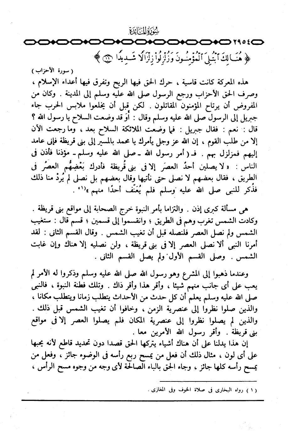 هذه المعركة كانت قاسية، حرك الحق فيها الريح وتفرق فيها أعداء الإسلام، وصرف الحق الأحزاب ورجع الرسول صَلَّى اللَّهُ عَلَيْهِ وَسَلَّم َ إلى المدينة. وكان من المفروض أن يرتاح المؤمنون المقاتلون. لكن قبل أن يخلعوا ملابس الحرب جاء جبريل إلى الرسول صَلَّى اللَّهُ عَلَيْهِ وَسَلَّم َ وقال: أَوَ قد وضعت السلاح يا رسول الله؟ قال: نعم: فقال جبريل: فما وضعت الملائكة السلاح بعد، وما رجعت الآن إلا من طلب القوم، إن الله عَزَّ وَجَلَّ يأمرك يا محمد بالمسير إلى بني قريظة فإني عامد إليهم فمزلزل بهم. ف (أمر رسول الله - صَلَّى اللَّهُ عَلَيْهِ وَسَلَّم َ - مؤذنا فأذن في الناس: «لا يصلين أحدٌ العصرَ إلا في بني قُريظة فأدرك بَعْضِهُّم العصرُ في الطريق، فقال بعضهم لا نصلي العصرَ حتى نأتيها وقال بعضهم بل نصلي لم يُردْ منا ذلك فذُكر للنبي صَلَّى اللَّهُ عَلَيْهِ وَسَلَّم َ فلم يُعَنِّف أحدًا منهم» .